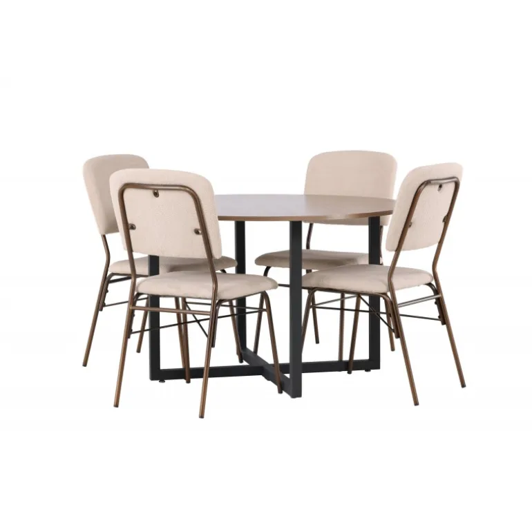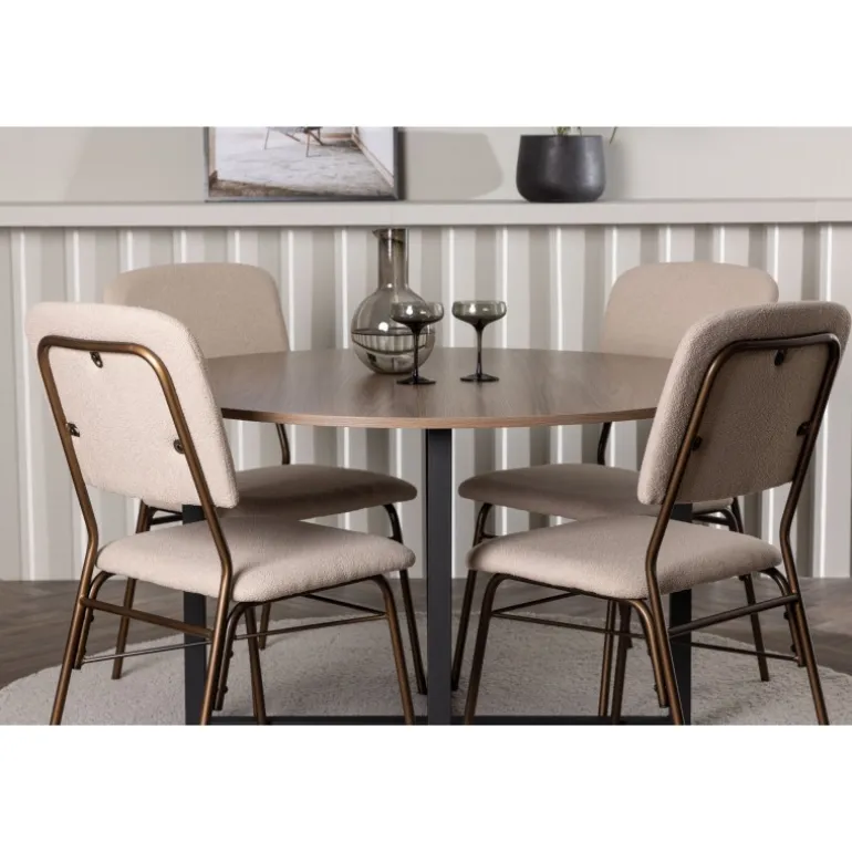 Byd velkommen i dit hjem med et moderne og charmerende blikfang takket være dette Spisebordssæt i jordfarver og stilfuldt skandinavisk design! Vores runde spisebord Durango er en tidløs favorit med sine bløde, runde former og unikke design. Den træfarvede MDF bordplade tilføjer en varm og indbydende følelse til din stue. Med lige ben, der elegant samles i et gulvnært kryds, får du også en stabil og robust ramme til dine måltider. Bordets dimensioner: 120 cm. Her i en vidunderlig kombination med beige spisestole fra Seda-serien. Stolene er perfekte til at skabe den rette balance mellem stil og komfort. Stolen er polstret i et smukt beige polyesterstof med en subtil tekstur, som ikke kun er stilfuldt men også utroligt komfortabelt. Stolebenene i mørkebrun stål giver en stabil base og et moderne touch til dit interiør. Den jordfarvede kombination mellem Durango-bordet og Seda-stolene tilføjer en stilfuld og elegant atmosfære til din stue. Denne kombination er også nem at matche med andre møbler og indretningsstile, hvilket giver dig friheden til at skabe din egen personlige stil i hjertet af dit hjem!