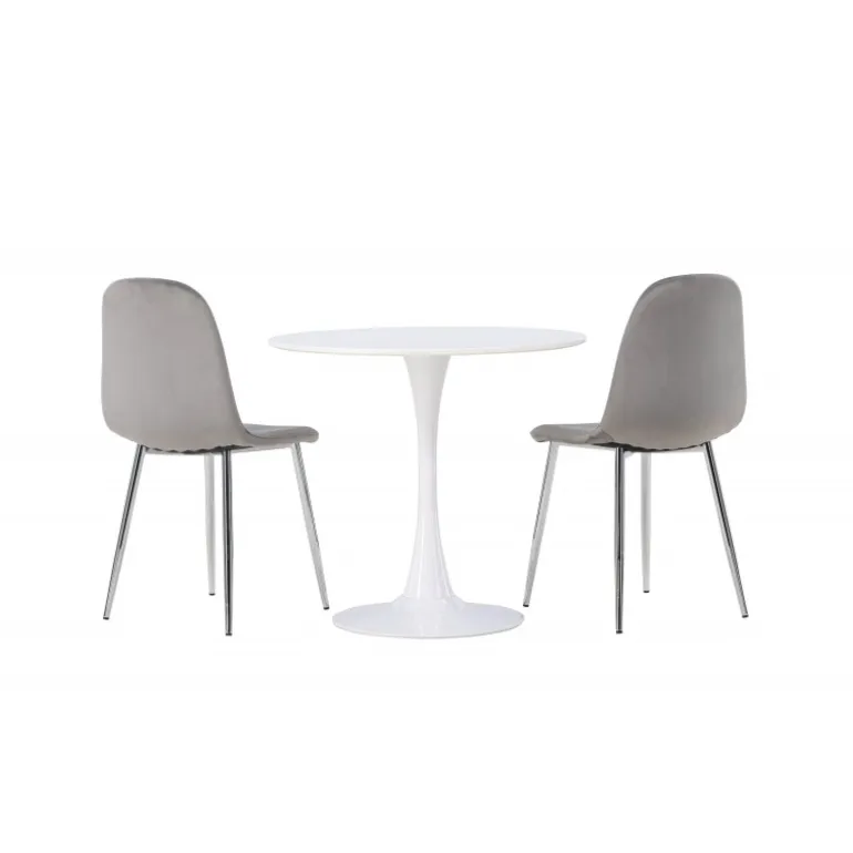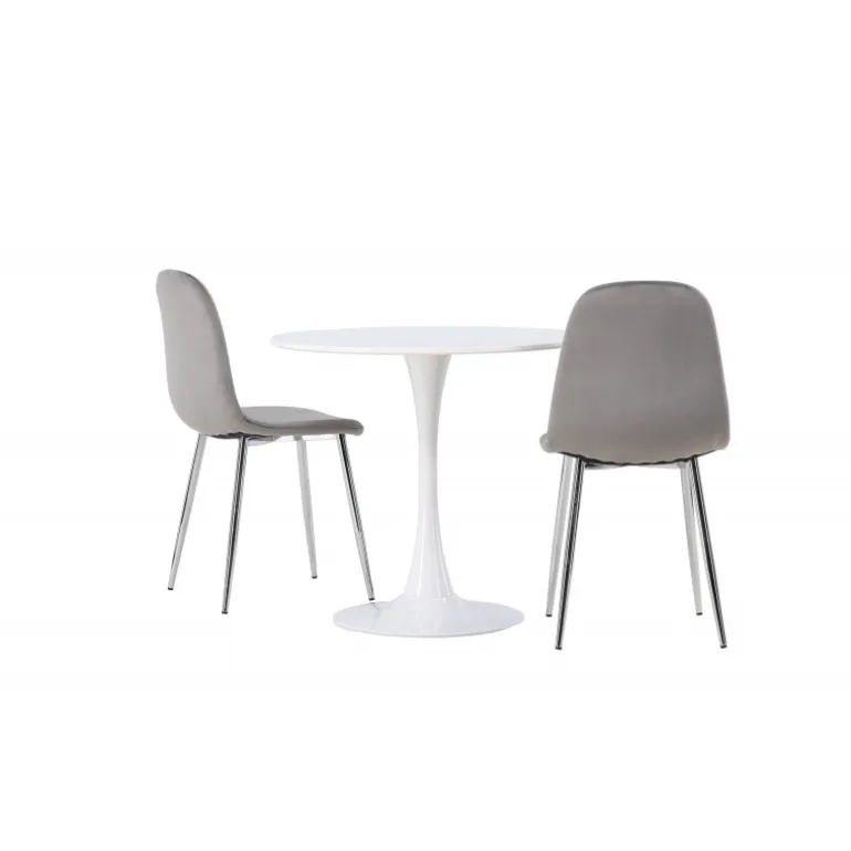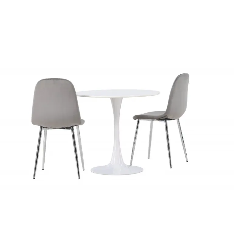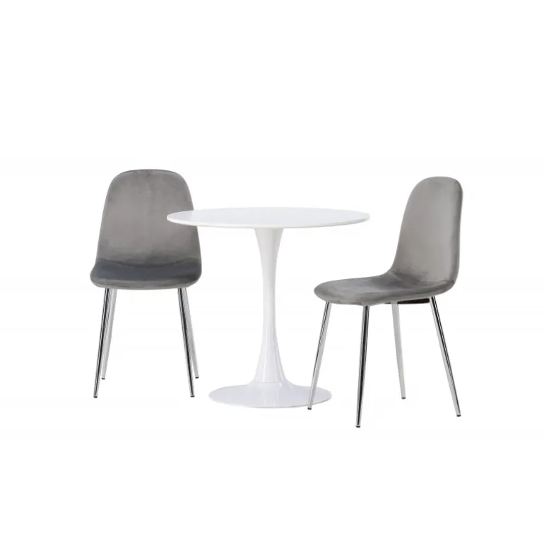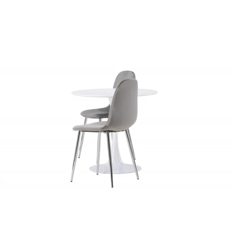 En stilfuld farvekombination! Det runde spisebord Hamden har en tynd bordplade i hvid MDF og en elegant trompetfod i hvidt stål. Her i en moderne kombination med grå spisestole fra Eva-serien. Stolen har et fuldt polstret design med ben i krommetal, en let afrundet ryg og sæde i slankt gråt velourstof med blød polstring for ekstra komfort. Sæt dig ned og sid behageligt! Borddiameter: 60 cm.
