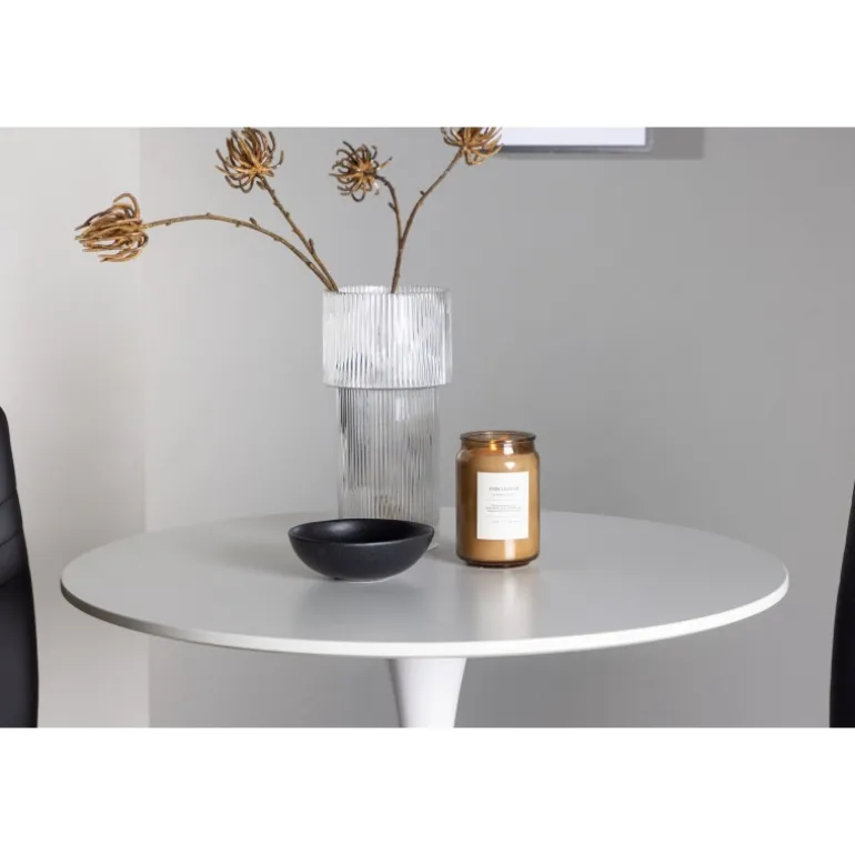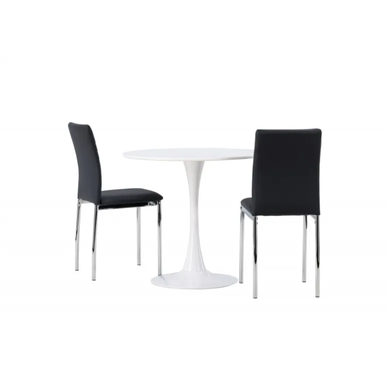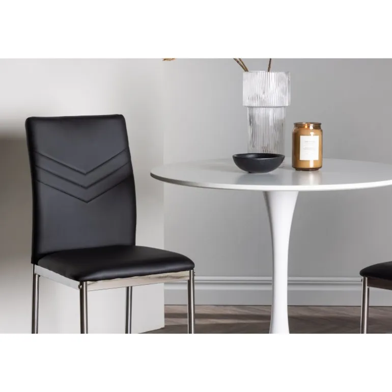 Dette sæt passer perfekt i det lille køkken! Det runde spisebord Hamden har en tynd bordplade i hvid MDF og en stilfuld trompetfod i hvid stål. Her sammen med dekorative, sorte spisebordsstole fra Lily-serien. Stolen er fuldt polstret i sort kunstlæder, og ryglænet har dekorative syninger, der bliver til en stilfuld detalje. Stolebenene er i forkromet stål og giver et stilfuldt industrielt look, der fanger øjet. Skab et charmerende midtpunkt i dit hjem! Bordets diameter: 60 cm.