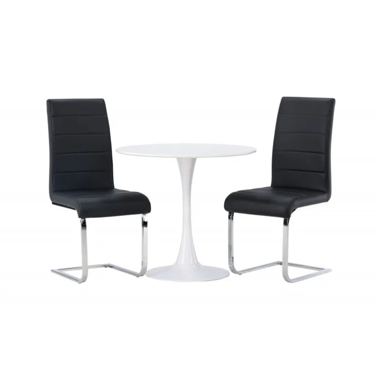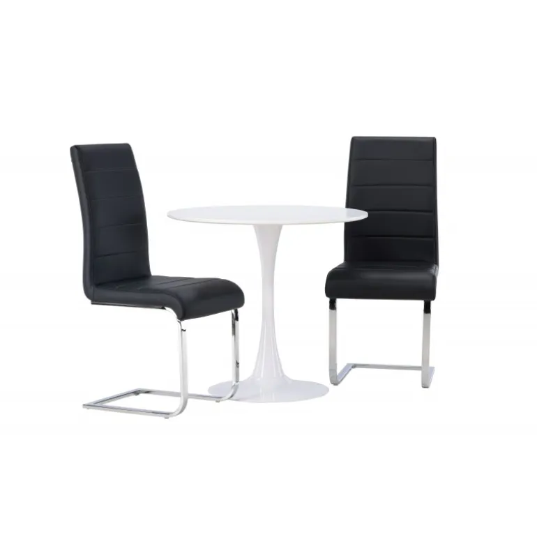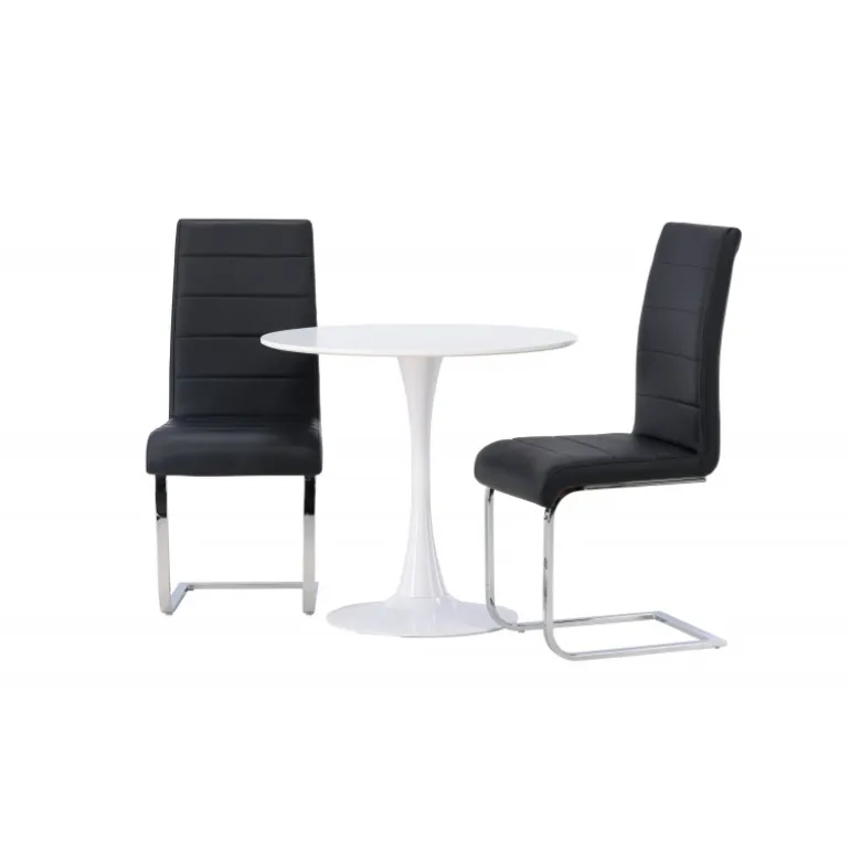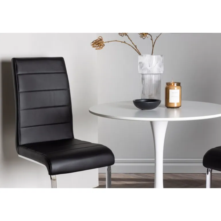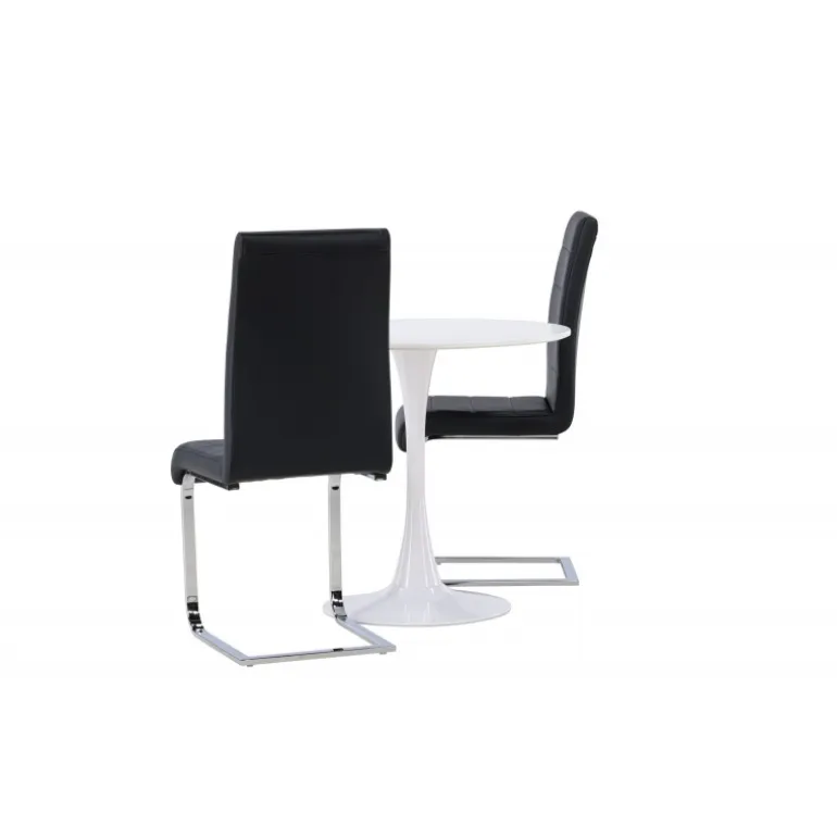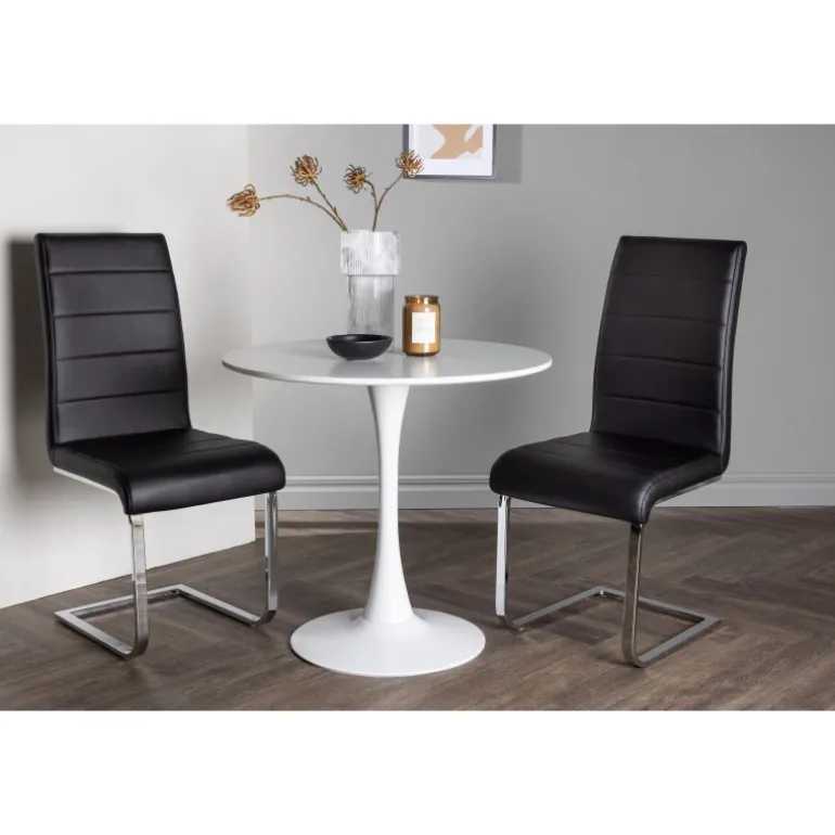 Oplev en skøn kombination af industriel design og høj komfort! Det runde spisebord Hamden har en tynd bordplade i hvid MDF og en stilfuld trompetfod i hvid stål. Sammen med de elegante, sorte spisestole fra Tempo-serien skaber det en perfekt gruppe til det mindre køkken. Stolen har en lige ryg i sort PU med dekorative syninger og ben i forkromet metal. Bordets diameter: 60 cm.