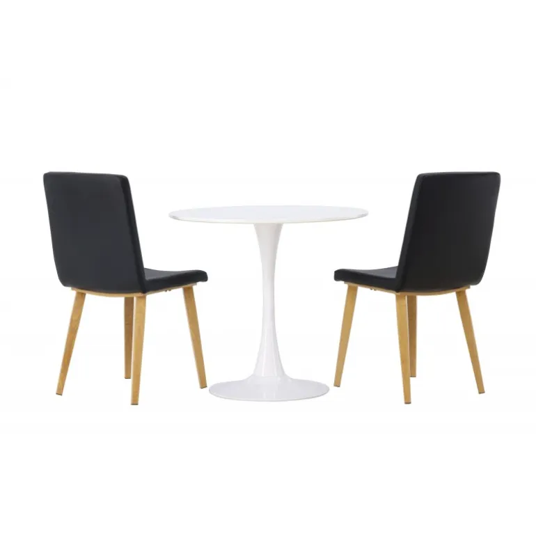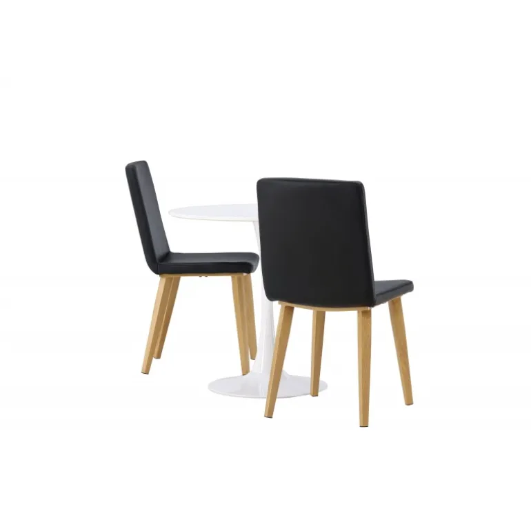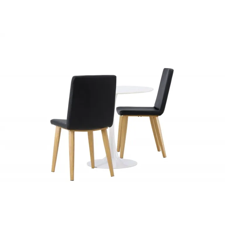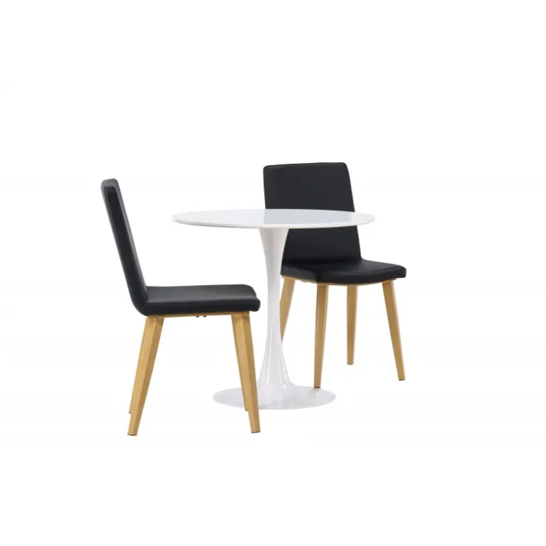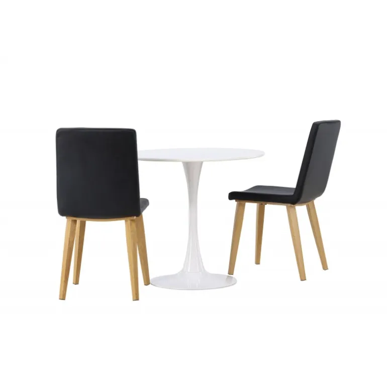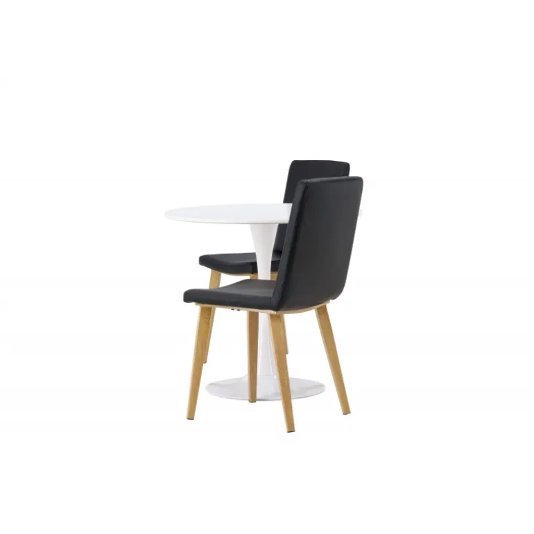 Indret komfortabelt og luksuriøst! Det runde spisebord Hamden har en tynd bordplade i hvid MDF og et stilfuldt trompetben i hvidt stål. Her sammen med klassiske spisestole fra Today-serien. Stolen har lige nordiske former og et glat, fuldt polstret sæde i sort kunstlæder. Stolebenene er let udadgående i naturtræ og giver et stabilt indtryk. Skab en personlig atmosfære! Bordets diameter: 60 cm.