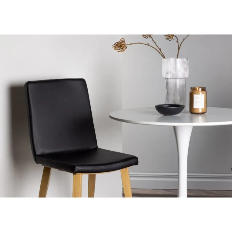 - Klassiske stole: Lige nordiske former med glat, fuldt polstret sæde i sort kunstlæder.