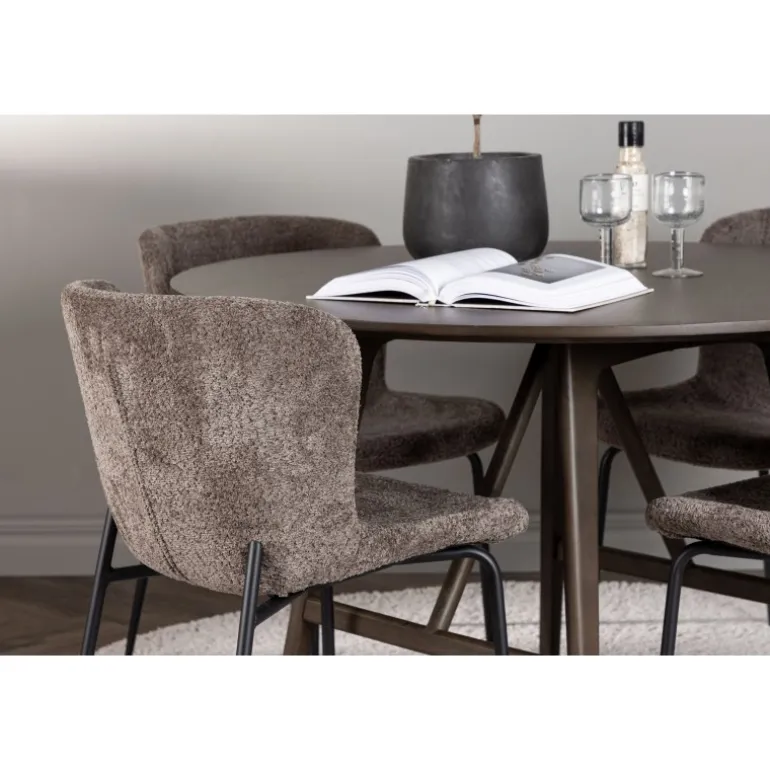 Oplev elegant luksus og tidløs skandinavisk design med vores Spisebordssæt Kaseindon med Modesto stole! Vores runde spisebord, Kaseindon, har et moderne design med en slank bordplade og nænsomt buede ben lavet af bæredygtigt MDF og gummitræ. Bordet udstråler jordnær elegance med sin varme valnøddebrune nuance, som også nemt matcher andet interiør. Bordets dimensioner er 100 cm. Sammen med stolene fra Modesto-serien skaber Kaseindon et perfekt match. Disse trendy stole er betrukket med gråt plysstof og har elegante, slanke sorte metalben. Den let afrundede rygstøtte og den polstrede sædepude giver fantastisk komfort, der forlænger de hyggelige stunder omkring spisebordet. Så snart du sætter dig, føler du straks en følelse af luksus og velvære. Dette Spisebordssæt skaber virkelig en atmosfære, hvor du kan nyde måltider med familie og venner, mens du føler dig afslappet og rolig. Det skal føles godt at komme hjem!