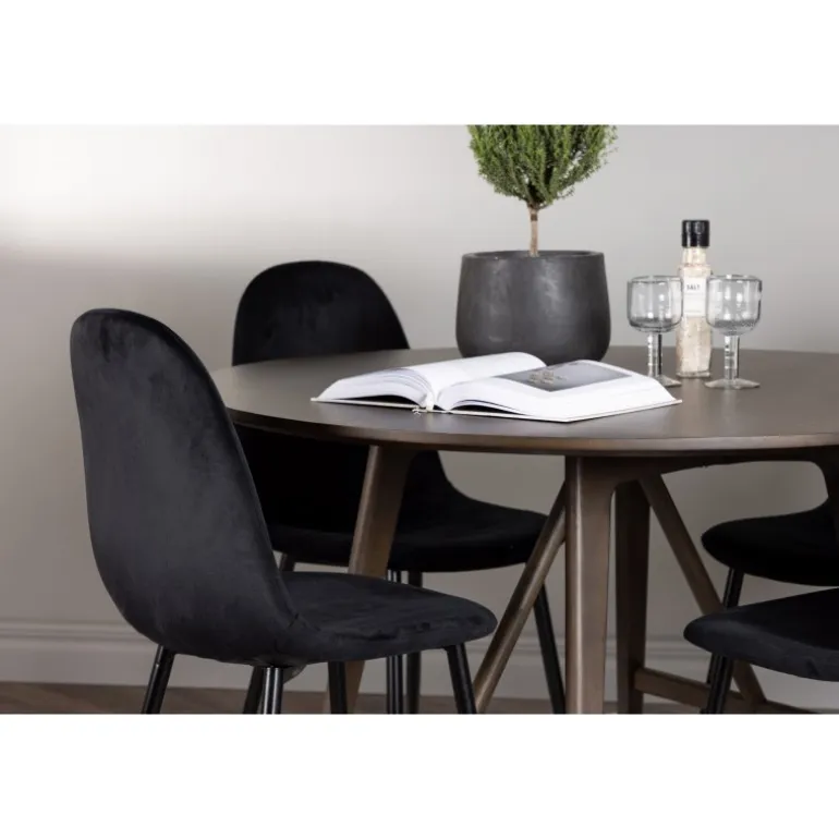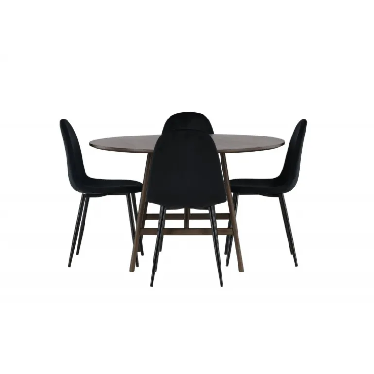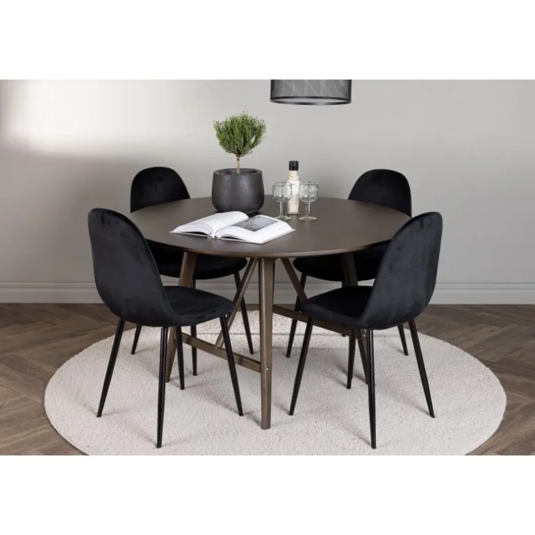 Skab en uimodståelig atmosfære i dit hjem med Kaseidon Spisebordssættet og de elegante Polar stole! Vores runde spisebord, Kaseidon, er perfekt for dem, der ønsker en stilfuld Spisebordssæt. Med sin runde MDF-bordplade og let udfladede ben i gummitræ, tilføjer dette moderne bord et trendbevidst touch til din stue. Men prikken over i’et er den mørkebrune farve, som giver bordet det lille ekstra, en varm tone, der hurtigt smelter ind i det moderne hjem. Bordmål: 100 cm. De elegante Polar stole komplementerer perfekt vores mørkebrune spisebord. Stolene har et fuldt polstret design med en afrundet ryg og sæde i sort velourstof, som giver en luksuriøs følelse. Den bløde polstring tilbyder en behagelig oplevelse, der får dig til at blive siddende længe efter middagen er slut. Med Kaseidon Spisebordssæt og Polar stole, får du ikke kun en praktisk og stilfuld Spisebordssæt, men også møbler der får dig og dine gæster til at føle sig hjemme. Velkommen hjem til en Spisebordssæt hvor stil og komfort mødes i perfekt harmoni!