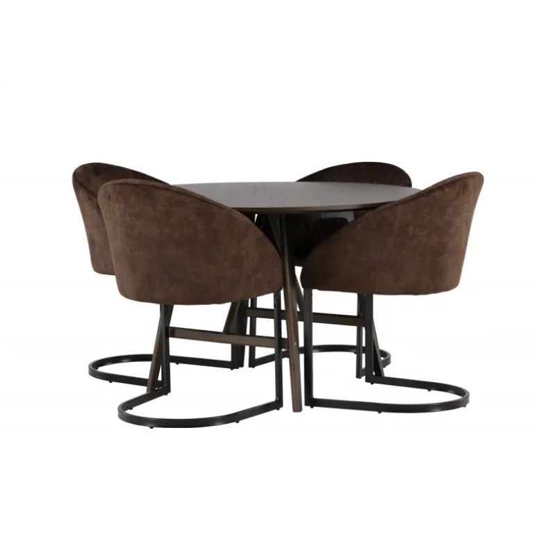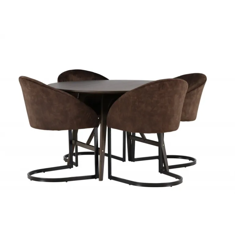 Skab en tidløs og luksuriøs atmosfære i dit moderne hjem med dette elegante Spisebordssæt! Vores runde spisebord, Kaseindon, har et iøjnefaldende design. Med en tynd bordplade og let buede ben har bordet et moderne og elegant udtryk. Bordet er helt lavet af MDF og gummitræ i en smagfuld valnøddebrun farve. Bords dimensioner: 100 cm. Her, kombineret med vores brune spisestole fra Evening-serien. Med sit nostalgiske udtryk og rene design bliver Evening-stolen en luksuriøs pynt ved dit spisebord. Den fuldt polstrede sæde og den buede ryglæn i brunt stof giver et komfortabelt og elegant udtryk til det samlede look, mens den minimalistiske base i mat brun stål tilføjer en stilfuld kontrast. Med dette Spisebordssæt kan du ikke kun nyde måltider i en elegant atmosfære, men også skabe et charmerende fokuspunkt i hjertet af dit hjem, hvor ingen risikerer at blive overset!