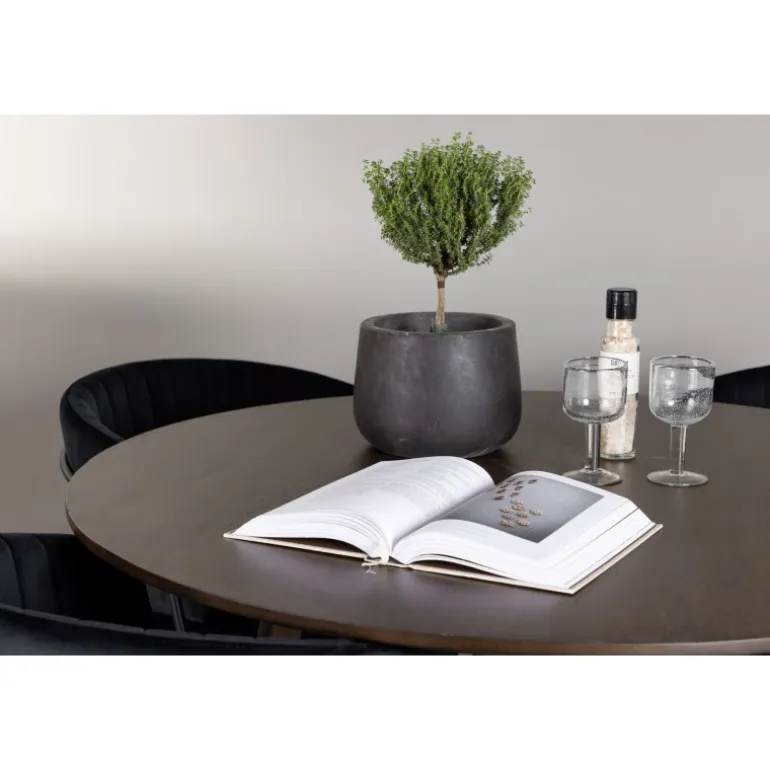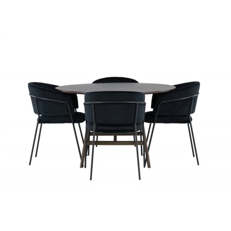 Skab et elegant midtpunkt for at samle venner og familie – et indbydende Spisebordssæt, der er perfekt til det stilfulde hjem! Vores brune spisebord, Kaseindon, har en rund MDF-bordplade og let udadbuede ben lavet af holdbart gummitræ. Men hvad der virkelig gør bordet til en favorit i mange hjem, er dets moderne valnøddefarvede nuance, der problemfrit passer ind i det elegante hjem og tilføjer en jordnær tone til indretningen. Bordet måler 100 cm. Sammen med vores sorte spisebordsstole fra Selma-serien skaber du et midtpunkt, der ikke kun er stilfuldt men også utroligt komfortabelt. Stolene har et fuldt polstret design med en let buet ryg og et sæde i fløjlsstof, der tilføjer en smuk glans til rummet. De elegante dekorative syninger giver ekstra detaljer og forstærker følelsen af eksklusivitet. Stolebenene er lavet af slankt sort stål, hvilket skaber et moderne og slankt indtryk. Så hvis du ønsker et Spisebordssæt, der ikke kun giver dig stil og elegance, men også komfort og luksus, behøver du ikke lede længere. Dette Spisebordssæt er den perfekte kombination til dit elegante hjem. Skab et charmerende midtpunkt, der tillader dine gæster at slappe af, og hvor du kan nyde vidunderlige øjeblikke sammen!