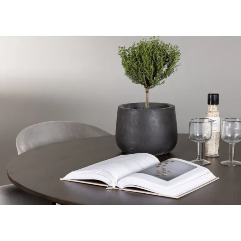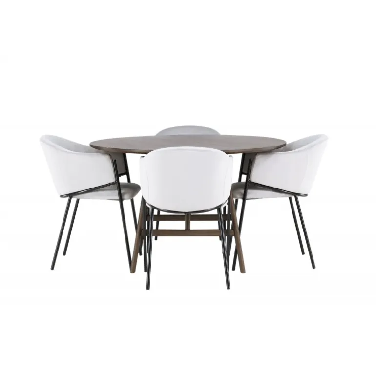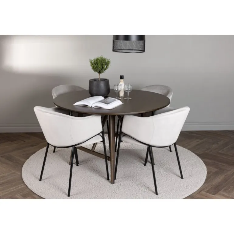 Skab et storslået midtpunkt i dit hjem med dette vidunderlige Spisebordssæt i rustik stil! Vores runde spisebord Kaseindon er det perfekte valg til moderne indretning. Dets valnødfarvede nuance tilføjer et sofistikeret touch til din stue og bliver et naturligt fokuspunkt i rummet. Bordpladen er lavet af MDF med en mat finish, og bordbenene er blødt buede i gummitræ med en stabiliserende ramme, der komplementerer bordets design perfekt. Bordets dimensioner: 100 cm. For at komplementere det mørkebrune bord på bedste vis har vi parret det med spisestole fra Evelina-serien. Denne stol har et moderne og slankt æstetisk design kombineret med fantastisk komfort. Nyd luksusen ved at sidde på et fuldt polstret sæde i lysegråt velourstof med en elegant buet ryg. Den minimalistiske ramme i sort stål tilføjer en stilfuld kontrast og giver stolen et unikt udtryk. Forkæl dig selv med en luksuriøs atmosfære og en hyggelig følelse, som disse møbler skaber. Giv dit hjem den elegance, det fortjener med Kaseindon og Evelina-stolene!