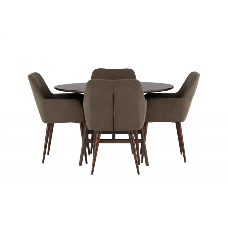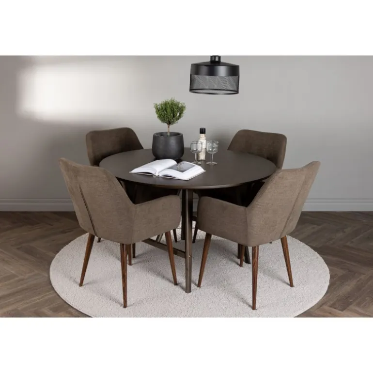Sid behageligt og nyd hyggelige måltider omkring et Spisebordssæt, der udstråler charme og komfort! Vores mørkebrune spisebord, Kaseindon, fanger straks opmærksomheden med sin runde form og moderne valnøddefarve. Den matte overflade på bordpladen, lavet af MDF, tilføjer en sofistikeret touch til din stue. Med let udadsvajede ben og en stabiliserende ramme i gummitræ tilbyder bordet både stil og holdbarhed. Bordets dimensioner: 100 cm. I kombination med vores brune spisebordsstole fra Tomorrow-serien skabes en perfekt harmoni i hjertet af dit hjem. Med deres fuldt polstrede sæder i brunt polyesterstof og integrerede armlæn tilbyder disse stole enestående komfort. De let udadsvajede stoleben i den moderne valnøddebrune farve bidrager til at skabe et sammenhængende look i din stue eller køkken. Her får du ikke kun en elegant indretning, men også muligheden for at skabe en hyggelig atmosfære til lange og behagelige måltider. Lad latter og samtaler flyde omkring et Spisebordssæt, hvor ingen risikerer at ende på kanten!