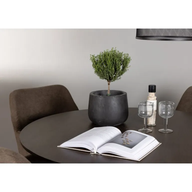 - Mørkebrunt rundt spisebord i moderne valnøddefarve.