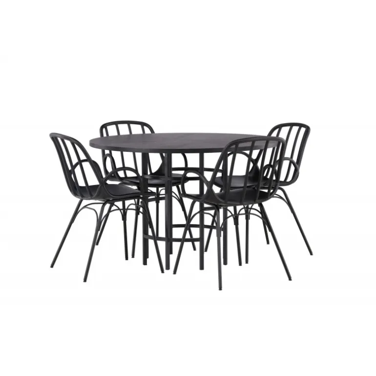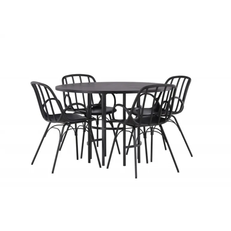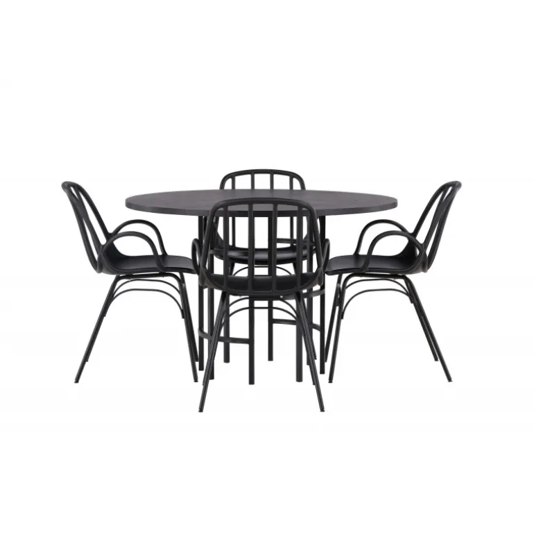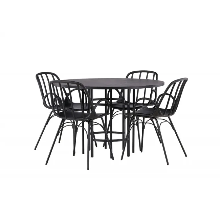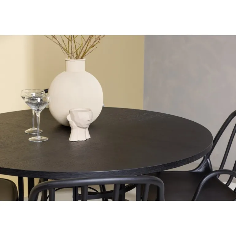 Dette elegante Spisebordssæt passer perfekt både i køkkenet og i den festlige stue! Vores runde spisebord København har en stilfuld, sort bordplade i MDF og en dekorativ, cylinderformet base i sort metal. Her kombineret med en velovervejet spisebordsstol fra serien Dyron. Stolen er lige så stilfuld som den er praktisk, fremstillet af sort plast og stål. Sædet har integrerede armlæn og et ribbet design i den let afrundede ryg. Stolebenene er elegant smalle og let udadskrånende i skandinavisk design. Sid trend-sikkert fremad! Bordets dimensioner: 115 cm.