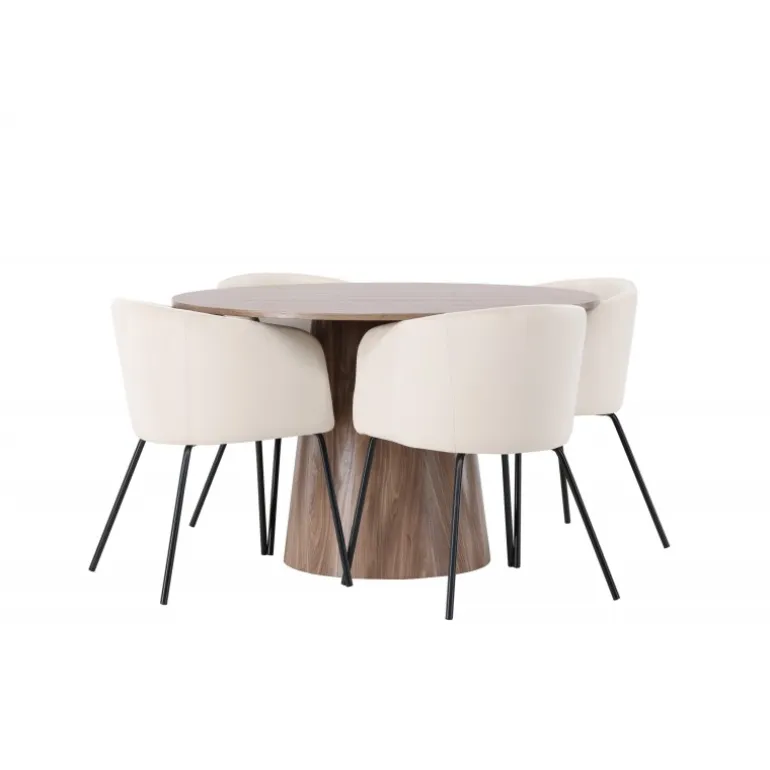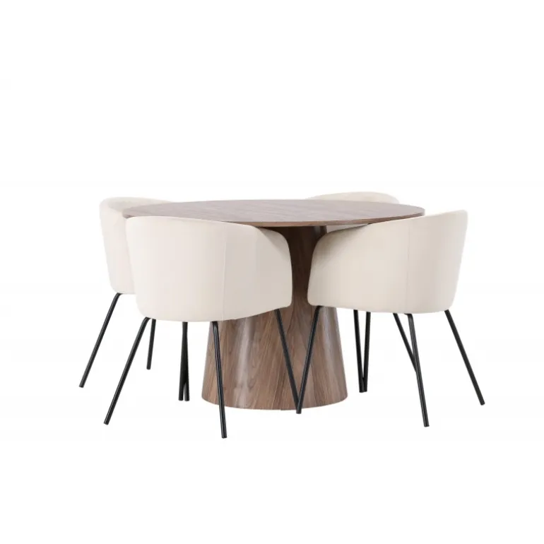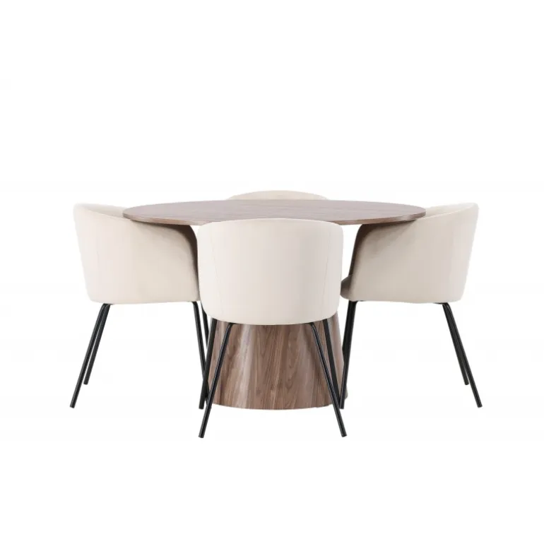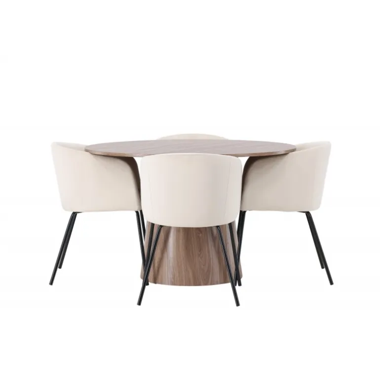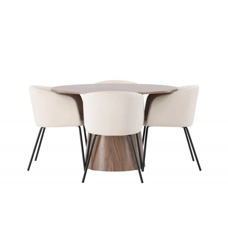 En favoritkombination i mange moderne hjem! Vores vidunderlige, runde spisebord Lanzo har et komplet MDF-design med en tynd top og en snoet cylindrisk ramme, der er centreret under midten af bordet. Farven er jordnær og gør mønsteret i materialet synligt. Her i elegant kombination med vores komfortable spisebordsstole Berit. Stolen har et fuldt polstret design med en let afrundet ryg og sæde i beige velourstof og smalle ben i sort jern. Det skal føles luksuriøst at sætte sig ned til gode måltider! Borddiameter: 120 cm.