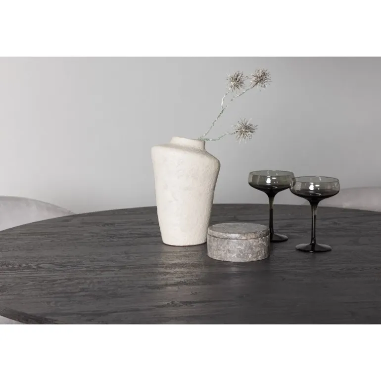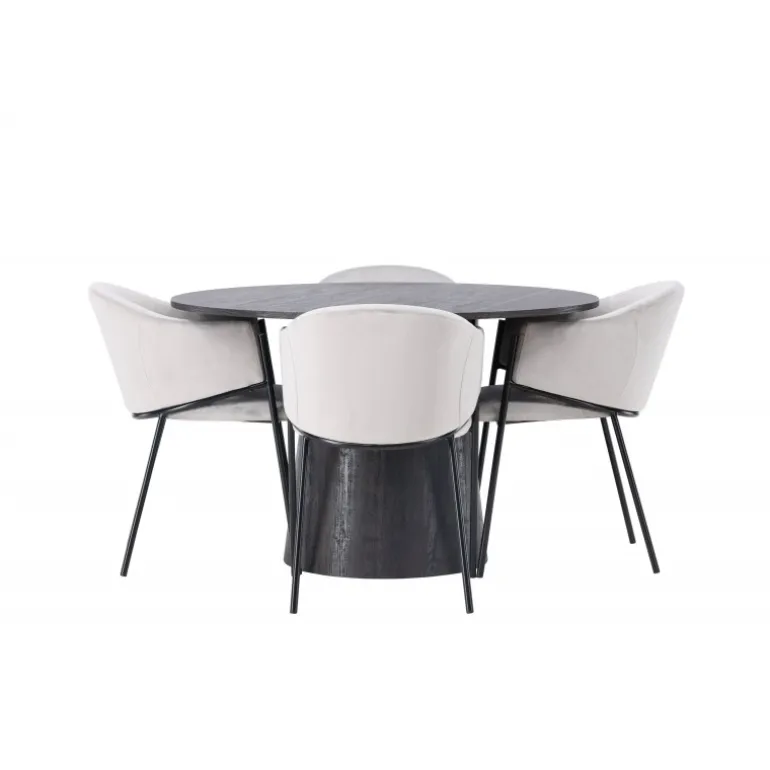 Dette design er både velovervejet og tidløst! Vores vidunderlige, runde spisebord Lanzo har et samlet design i brun MDF med en tynd top og en snoet cylindrisk ramme, der er centreret under midten af bordet. Her sammen med moderne, grå spisestole fra Evelina serien. Stolen har et fuldt polstret sæde med en afrundet ryg i lysegråt velourstof og dekorativ, minimalistisk benstruktur i sort stål. Kort sagt, en perfekt kombination! Borddiameter: 120 cm.