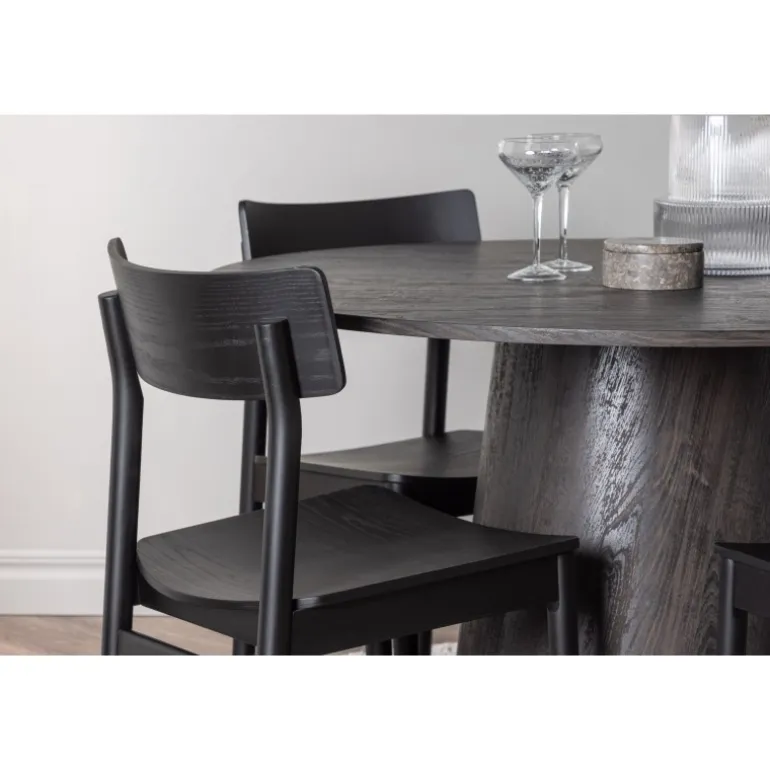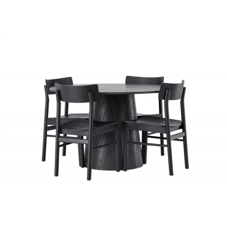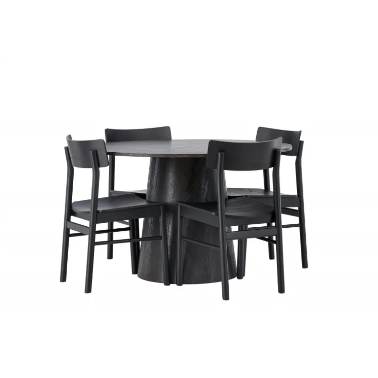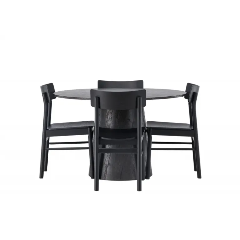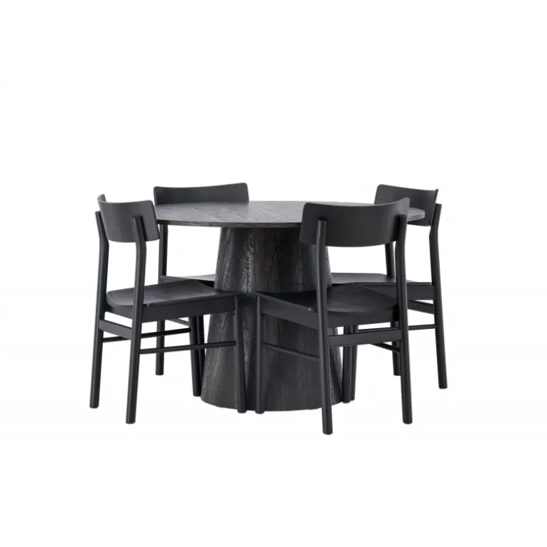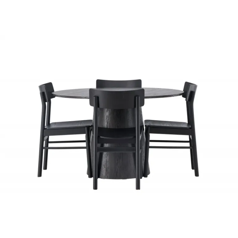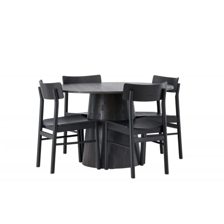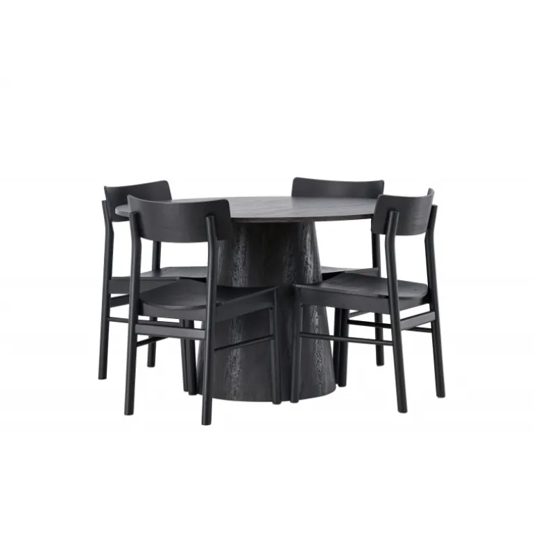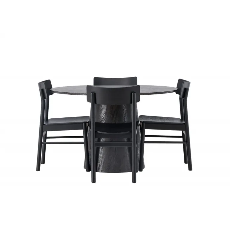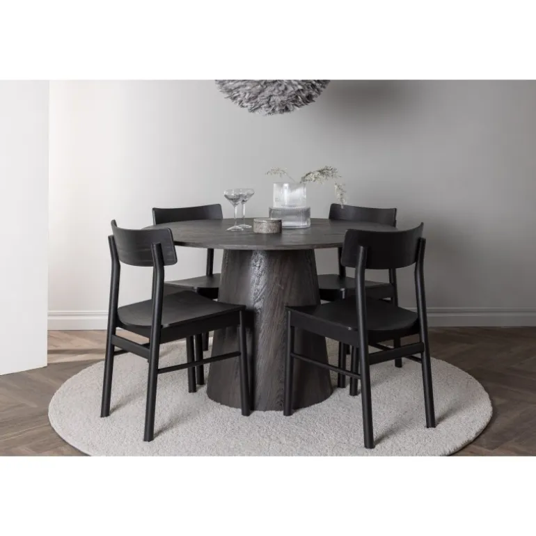 Skandinavisk design i sin bedste form! Vores vidunderlige, runde spisebord Lanzo har et overordnet design i brun MDF med en tynd top og en snoet cylindrisk ramme, der er centreret under bordet. Her i en smagfuld kombination med moderne spisebordsstole fra Montros-serien. Stolen har et klassisk og nostalgisk design med lige nordiske former, lavet af sort gummitræ hele vejen igennem. Helt enkelt, en perfekt match! Bordets diameter: 120 cm.