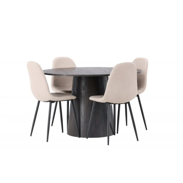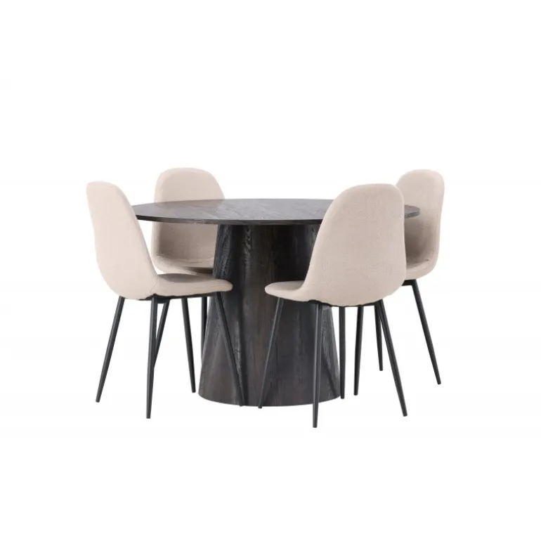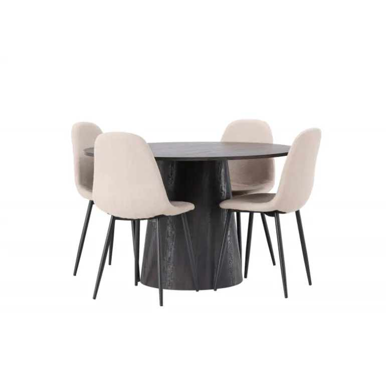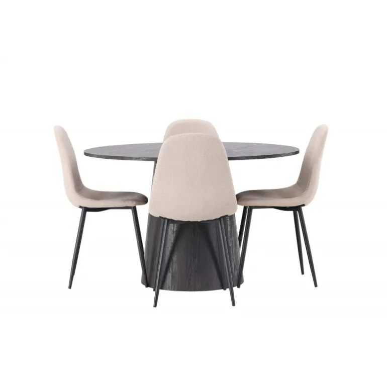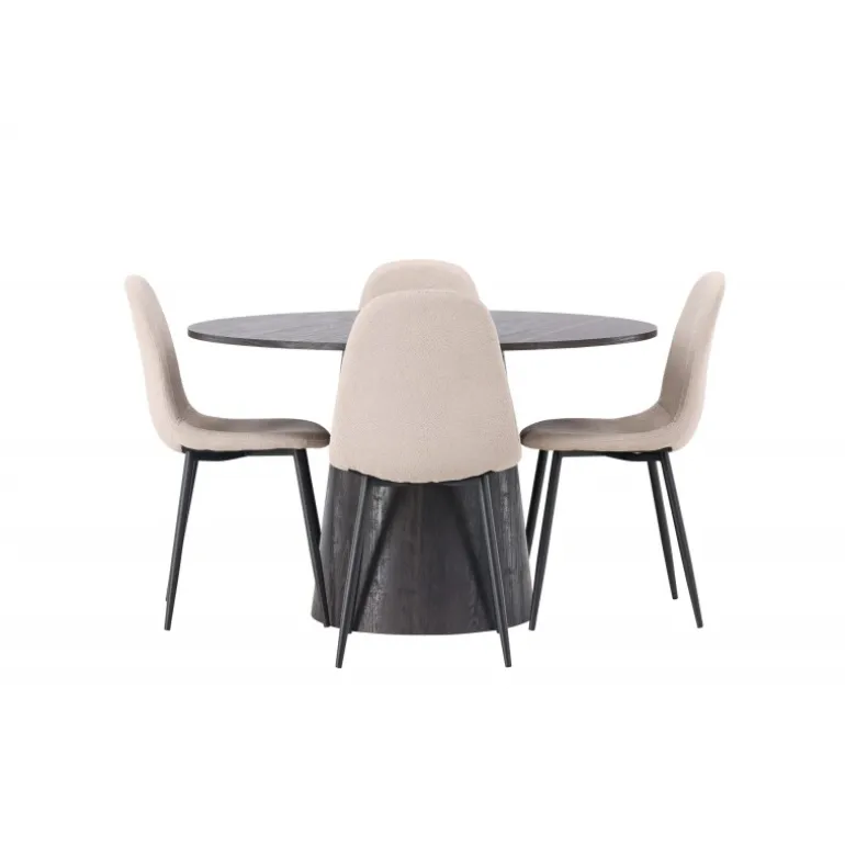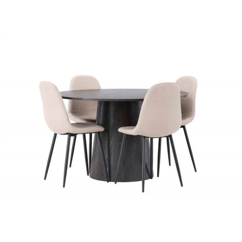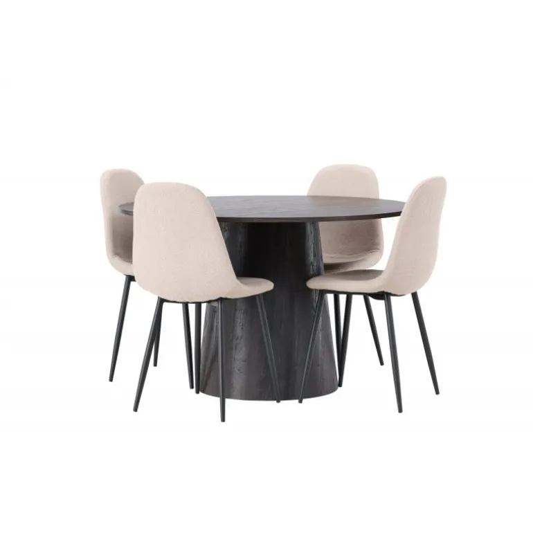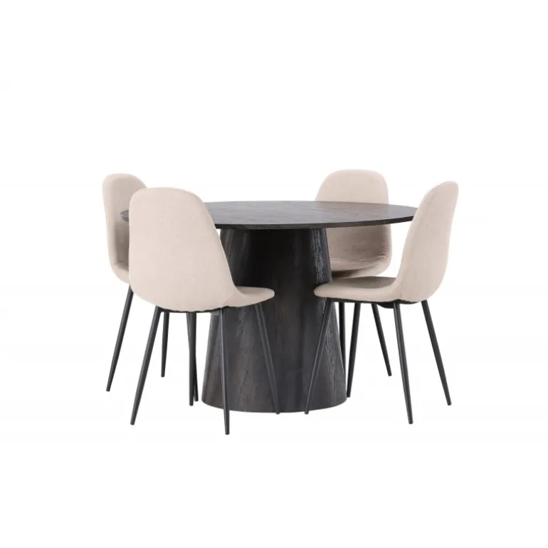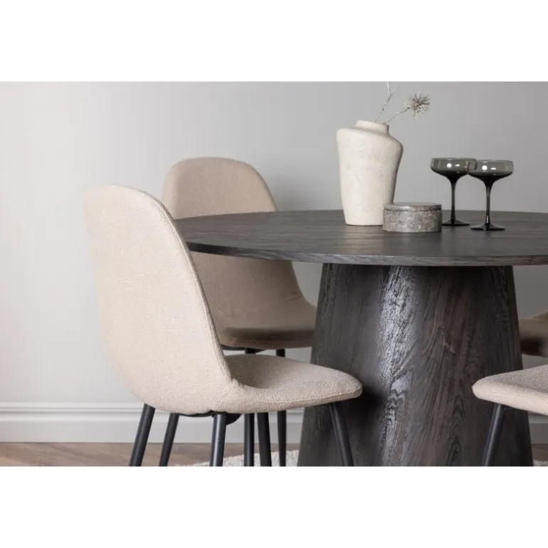 Jordnære toner og bløde former! Vores vidunderlige, runde spisebord Lanzo er designet i brun MDF med en tynd bordplade og en snoet cylindrisk ramme, der er centreret under midten af bordet. Her i en moderne kombination med beige spisebordsstole fra Polar-serien. Stolen har et fuldt polstret design, ben i sort pulverlakeret metal og en rundet ryg og sæde i beige boucle stof med blød polstring. Det bliver ikke bedre end dette! Borddiameter: 120cm.