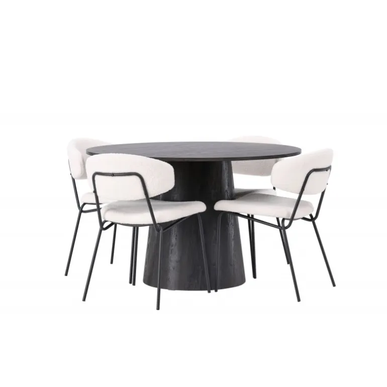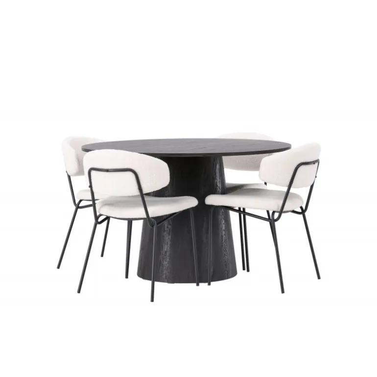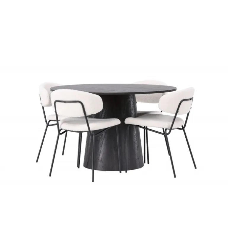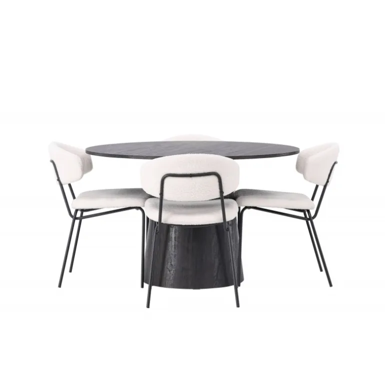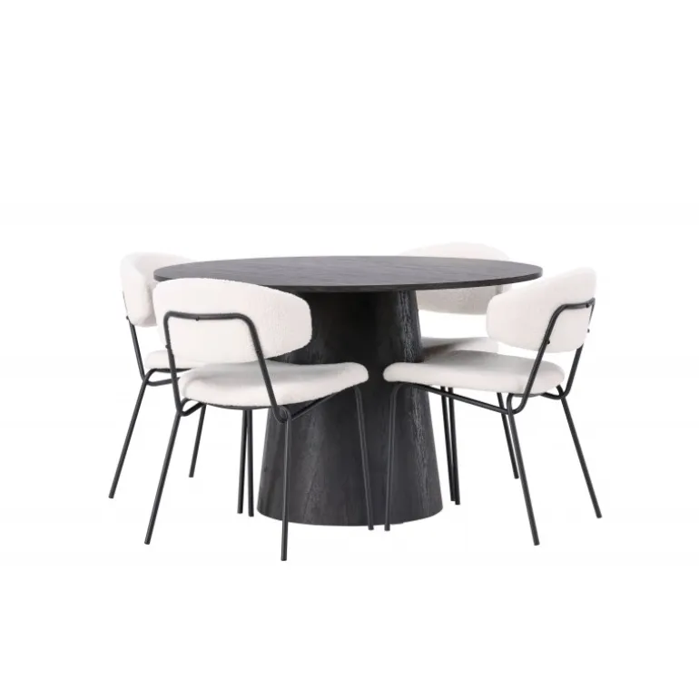 Dekorer dit hjem hyggeligt og indbydende! Vores vidunderlige, runde spisebord Lanzo har et overordnet design i brun MDF med en tynd top og en snoet cylindrisk ramme, der er centreret under bordet. Her i stilfuld kombination med vores hvide spisebordsstole fra Chico-serien. Stolen er i hvid bouclé stof med polstret sæde og ryglæn for ekstra komfort. Benene er smalle i sort stål, hvilket giver stolen en luftig følelse. Inviter til et charmerende midtpunkt! Borddiameter: 120 cm.