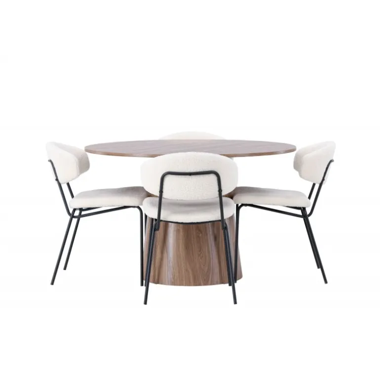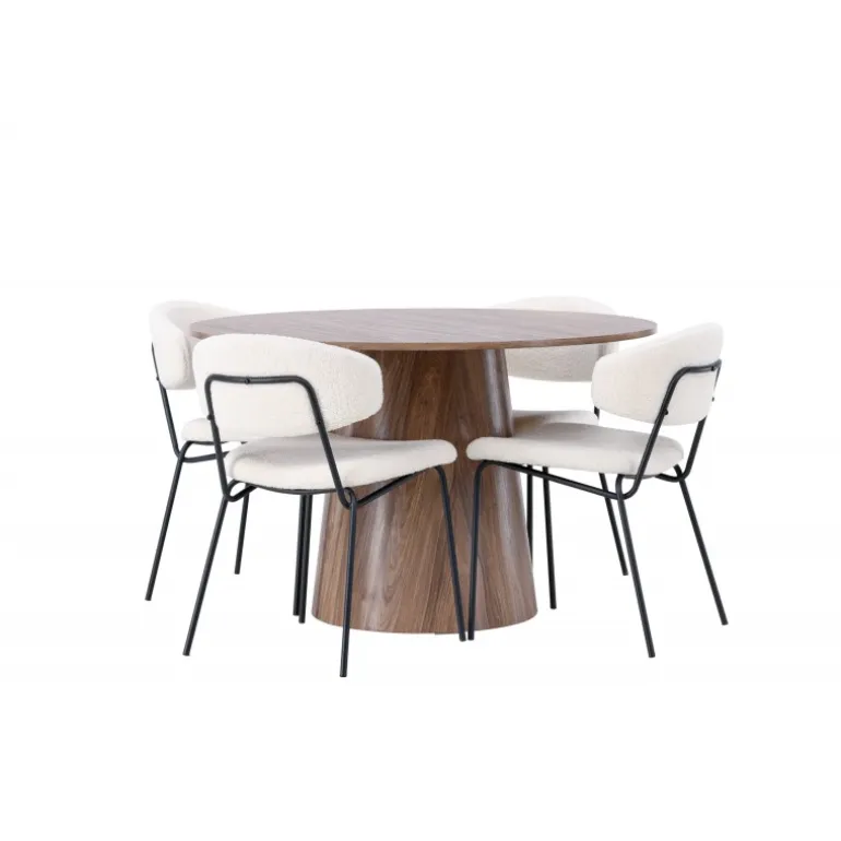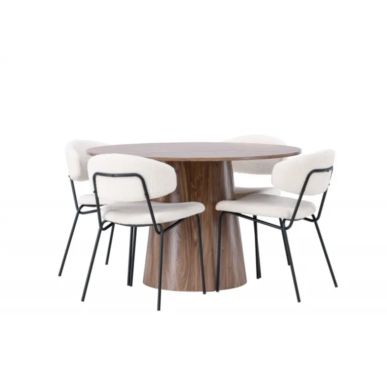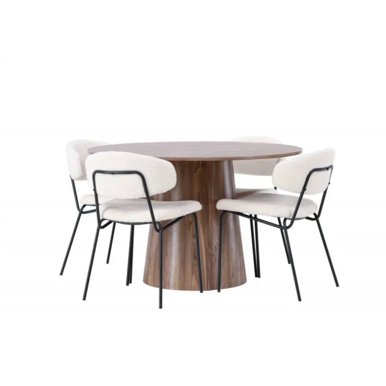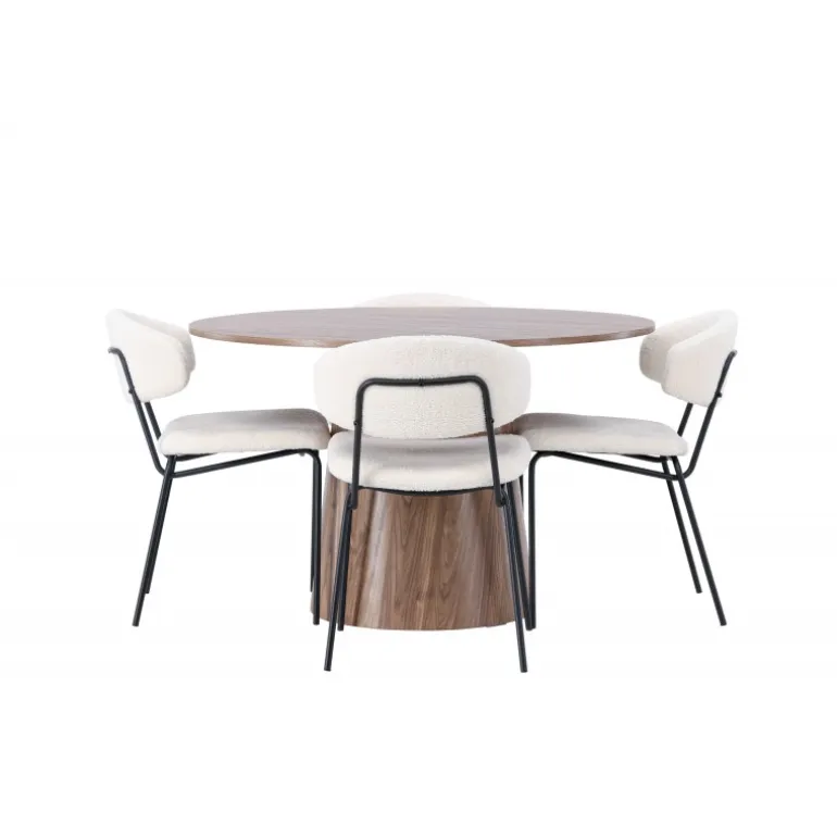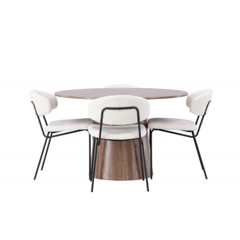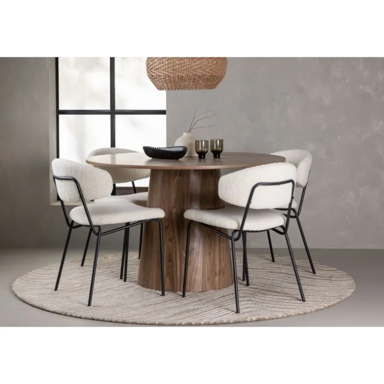 Det skal føles fantastisk at komme hjem! Inviter dine kære til hyggelige middage omkring dette elegante spisebord og sid behageligt i vores moderne spisebordsstole! Vores træfarvede spisebord Lanzo har et konsekvent design med en rund tynd MDF bordplade. Den snoede cylindriske base, som er centralt placeret under bordet, er prikken over i’et og tilføjer et iøjnefaldende element til rummet. Den naturlige farve fremhæver også materialets mønster på en stilfuld måde. Bordet måler 120 cm i diameter. Her i perfekt kombination med vores moderne hvide spisebordsstole Chico. Stolenes minimalisme kombineres perfekt med de bløde runde former og det elegante beige bouclé stof. Sædet og ryglænet er polstret for ekstra komfort under lange middage. Den slanke sorte stålkonstruktion er ikke kun en stilfuld detalje, men også i tråd med de nyeste indretningstrends. Lanzo og Chico er det perfekte par til at skabe en harmonisk og indbydende atmosfære i din spisestue. De komplementerer hinanden på en måde, der fanger opmærksomheden og skaber en unik følelse af stil og komfort – hvad mere kan man ønske sig?