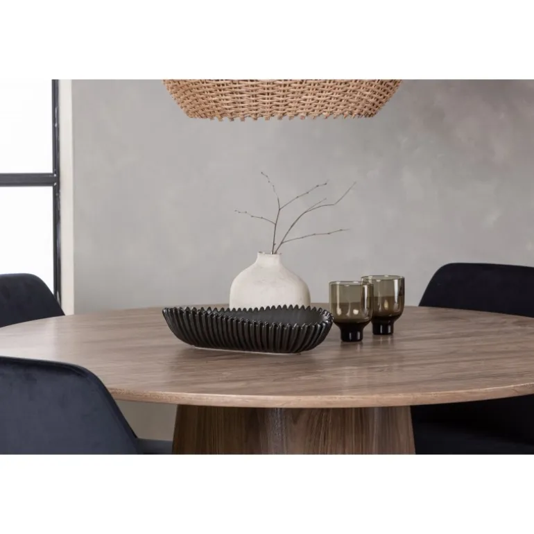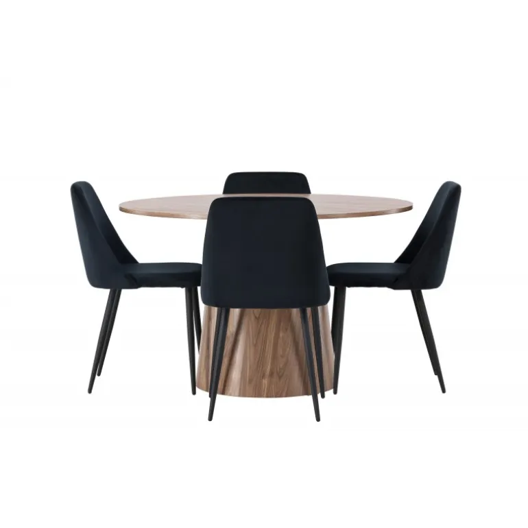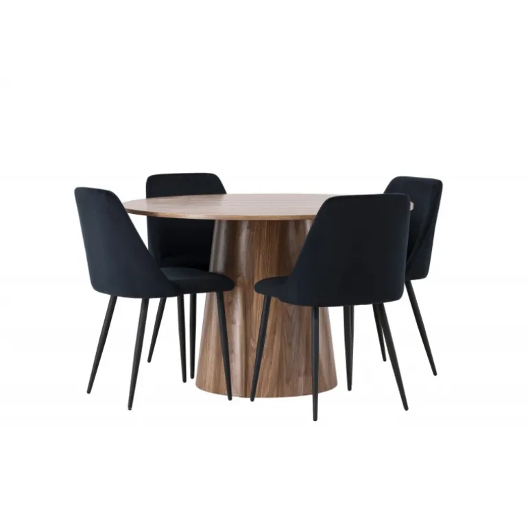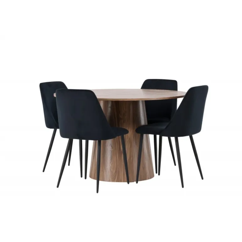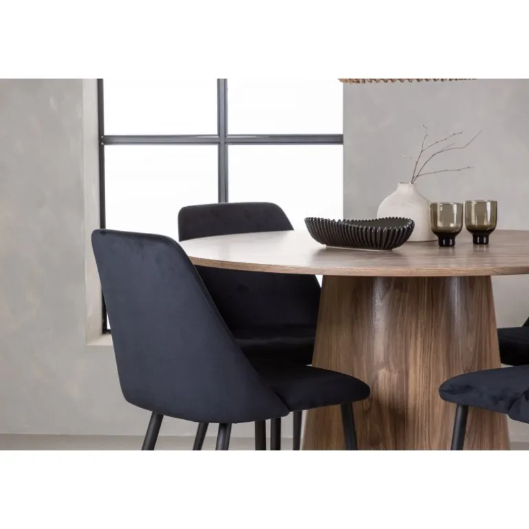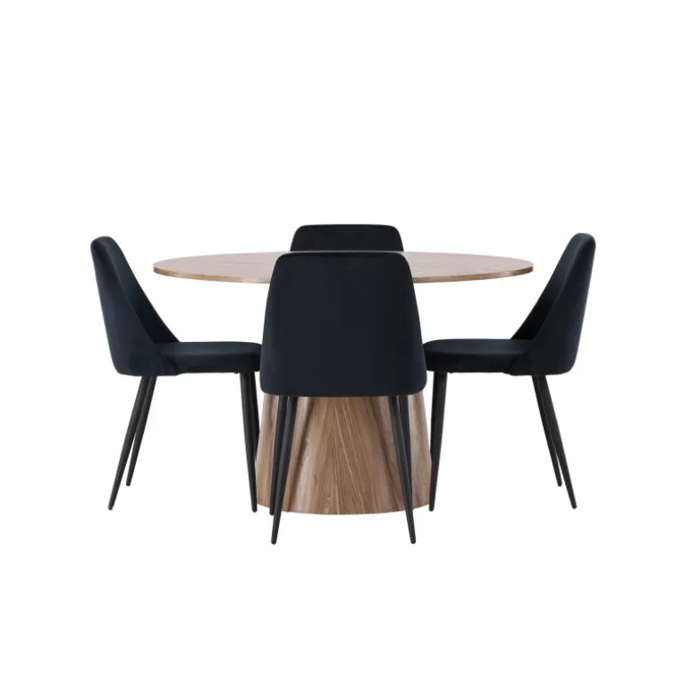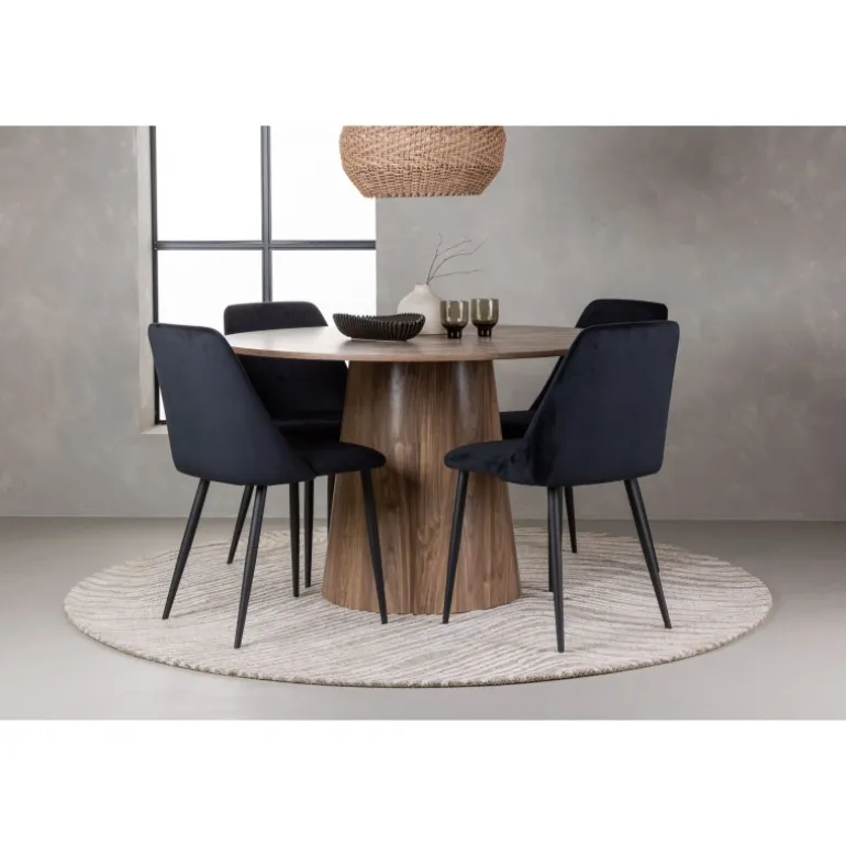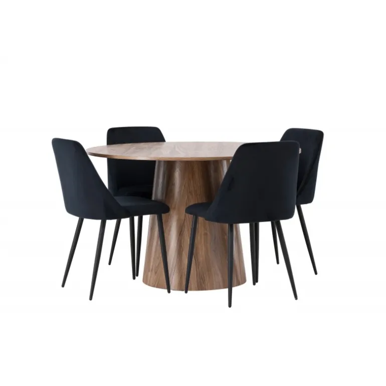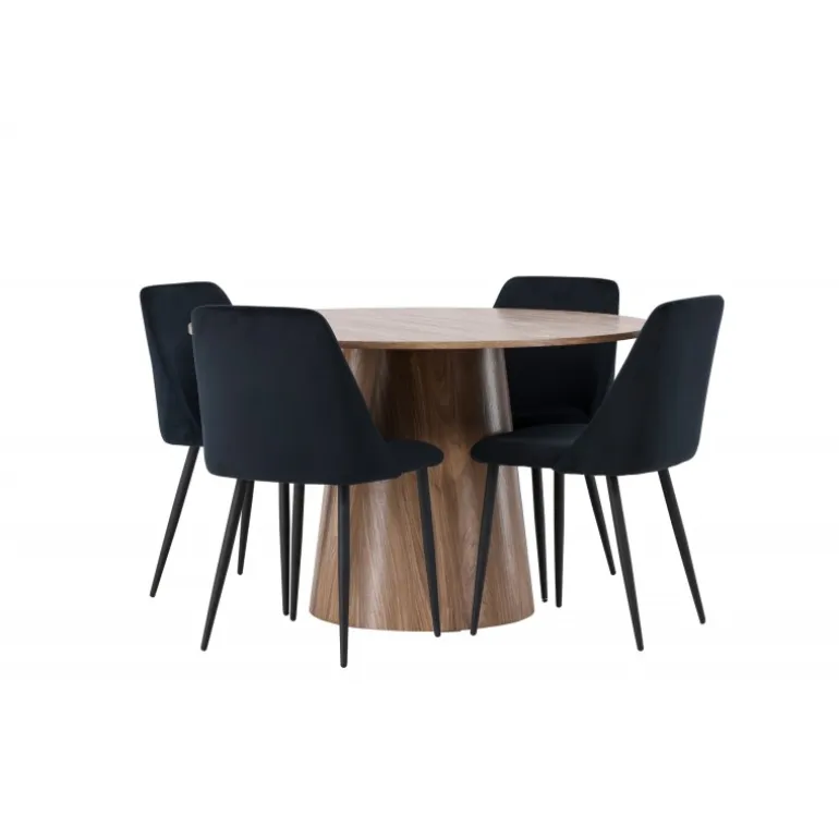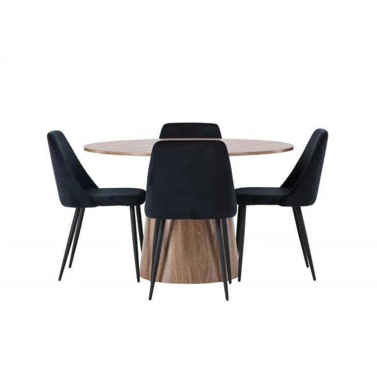 Det træfarvede spisebord Lanzo og de sorte stole Night er den perfekte kombination til at skabe en indbydende atmosfære i dit hjem! Med sit skandinaviske design og smagfulde håndværk imponerer dette Spisebordssæt straks dig og dine gæster. Dette runde spisebord fra Lanzo-serien er lavet af MDF og har en tynd, rund bordplade, der tilføjer et elegant touch til din spisestue. Den snoede, cylinderformede base, der er centreret under bordets midtpunkt, tilføjer en moderne twist til designet. Dens jordfarve fremhæver også materialets naturlige mønstre og skaber en harmonisk følelse i rummet. Bordet måler 120 cm i diameter. Sammen med dette moderne spisebord har vi vores slanke Night spiseborde. Med deres elegante og komfortable fuldt polstrede sæder i sort velourstof og matchende sorte stoleben tilføjer disse spiseborde en luksuriøs glans til rummet. Sædet er også polstret for ekstra komfort. Denne kombination skaber en indbydende og modebevidst atmosfære, der får dig til at føle dig som en VIP-gæst i dit eget hjem. Oplev komfort og elegance på samme tid!