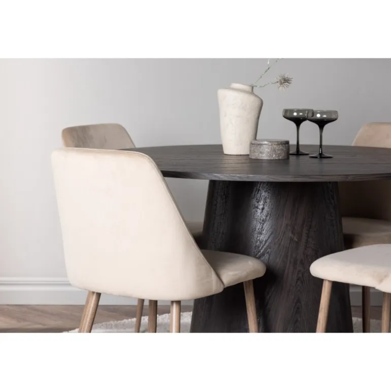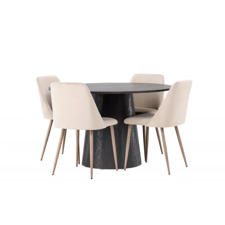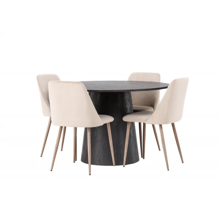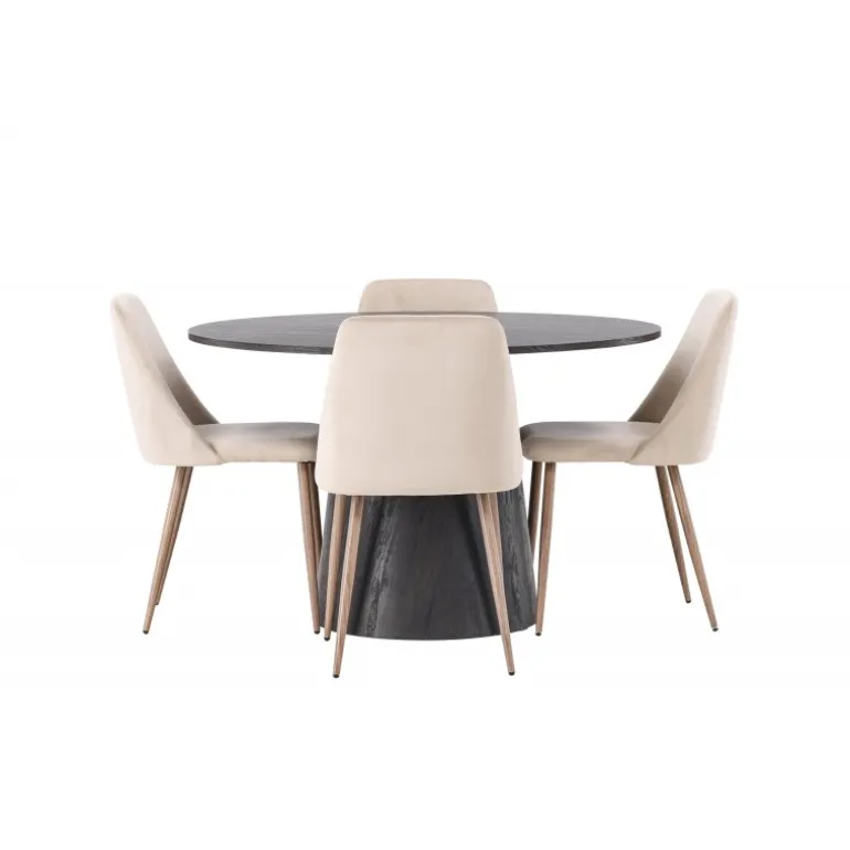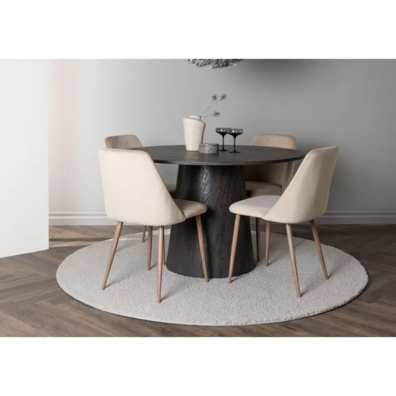 Varme toner og charmerende design! Vores vidunderlige, runde spisebord Lanzo har et overordnet design i brun MDF med en tynd top og en snoet cylindrisk ramme, der er centreret under midten af bordet. Her sammen med vores sandfarvede spisestole fra serien Night. Stolen har en fuldt polstret sæde i brunt velourstof og stolben i valnøddefarvet stål. Kort sagt, et fantastisk Spisebordssæt! Bordets diameter: 120 cm.