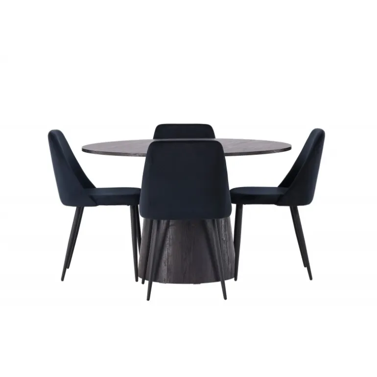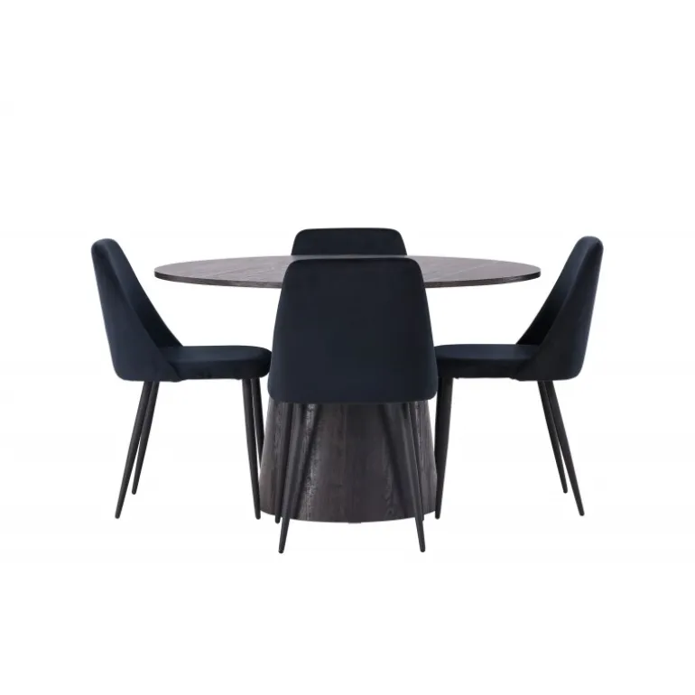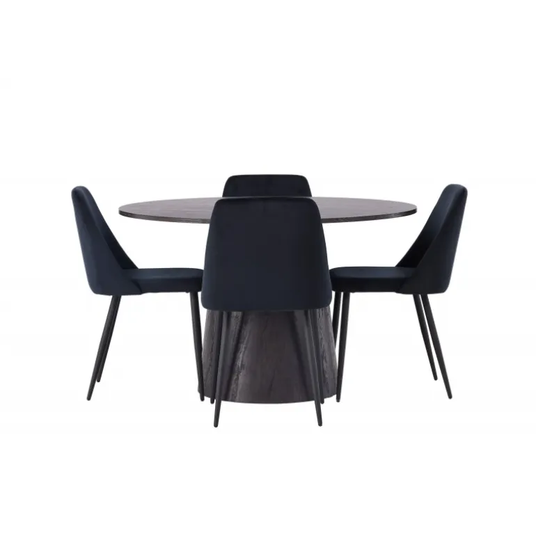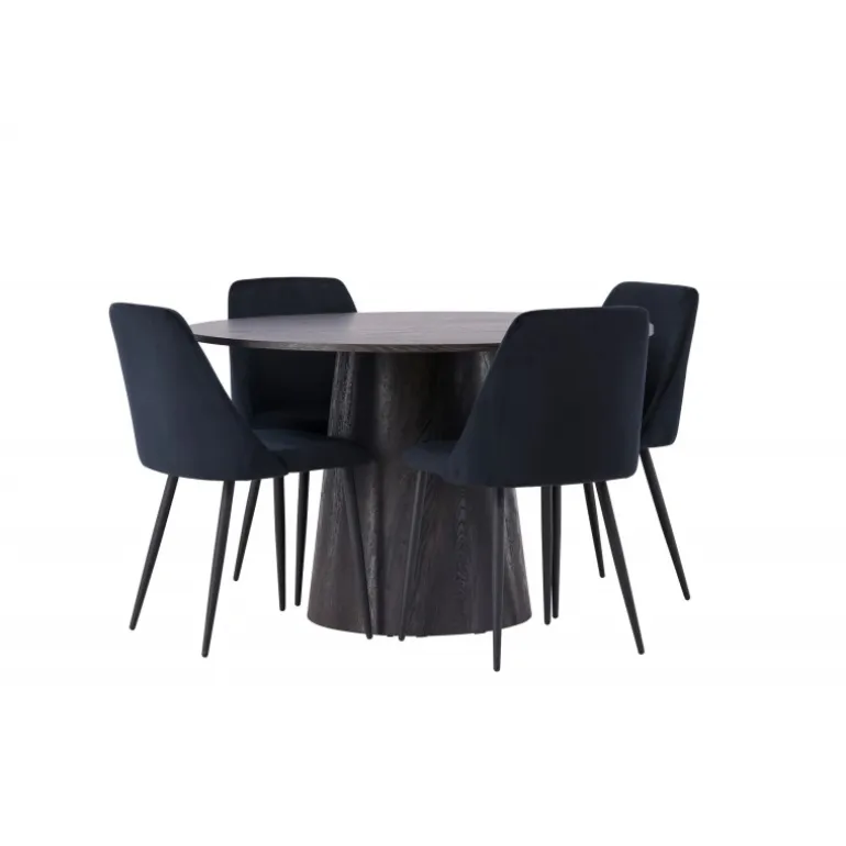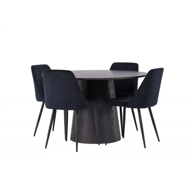 Skab en indbydende atmosfære! Vores vidunderlige, runde spisebord Lanzo har et design i brun MDF med en tynd bordplade og en snoet cylindrisk ramme, der er centreret under midten af bordet. Her i perfekt kombination med sorte spisestuestole fra serien Night. Stolen har en fuldt polstret sæde i sort velourstof og ben i matchende sort farve. Her sidder du så komfortabelt som moderne! Bordets diameter: 120 cm.