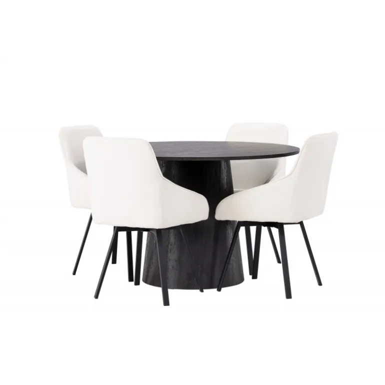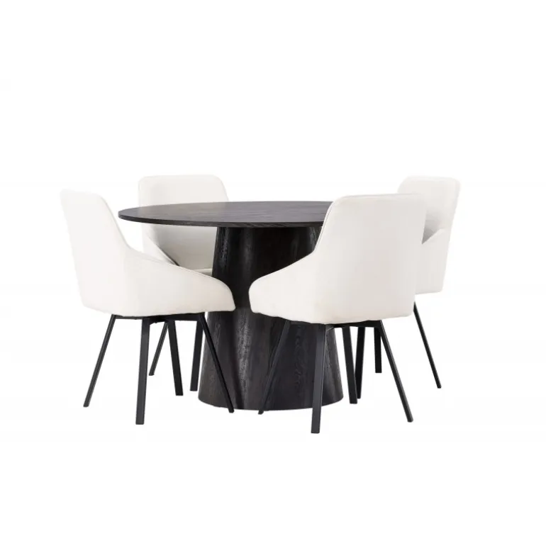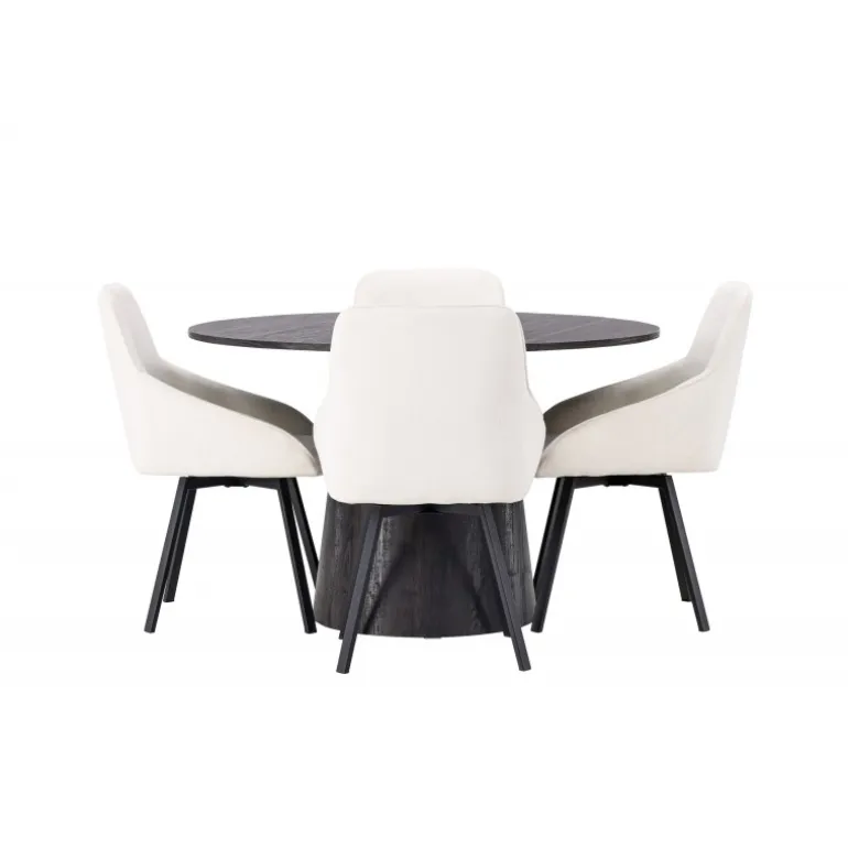 Dette Spisebordssæt udstråler luksus og bekvemmelighed! Vores vidunderlige, runde spisebord Lanzo har et overordnet design i brun MDF med en tynd top og en snoet cylindrisk ramme, der er centreret under midten af bordet. Her i stilfuld kombination med beige spisestole fra Rosie-serien. Stolen har et fuldt polstret sæde med integrerede armlæn i beige stof og let udadgående stoleben i sort metal. Det bløde sæde er polstret for ekstra komfort og inviterer til lange hyggelige middagsøjeblikke. Bordets diameter: 120cm.