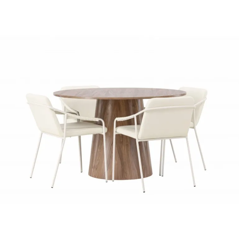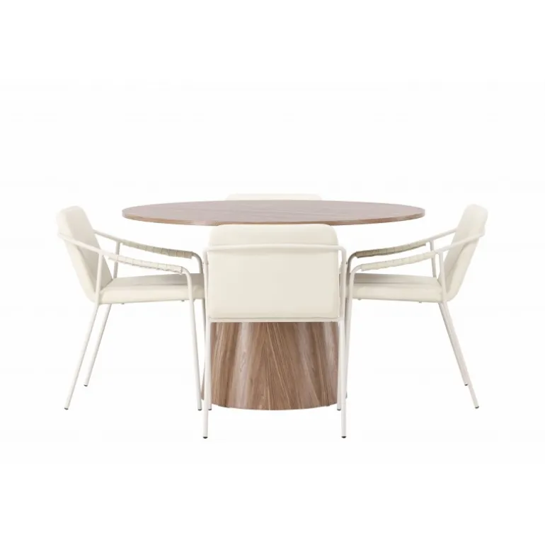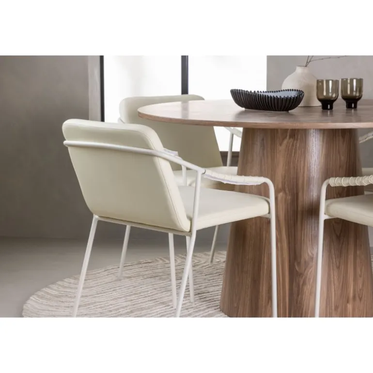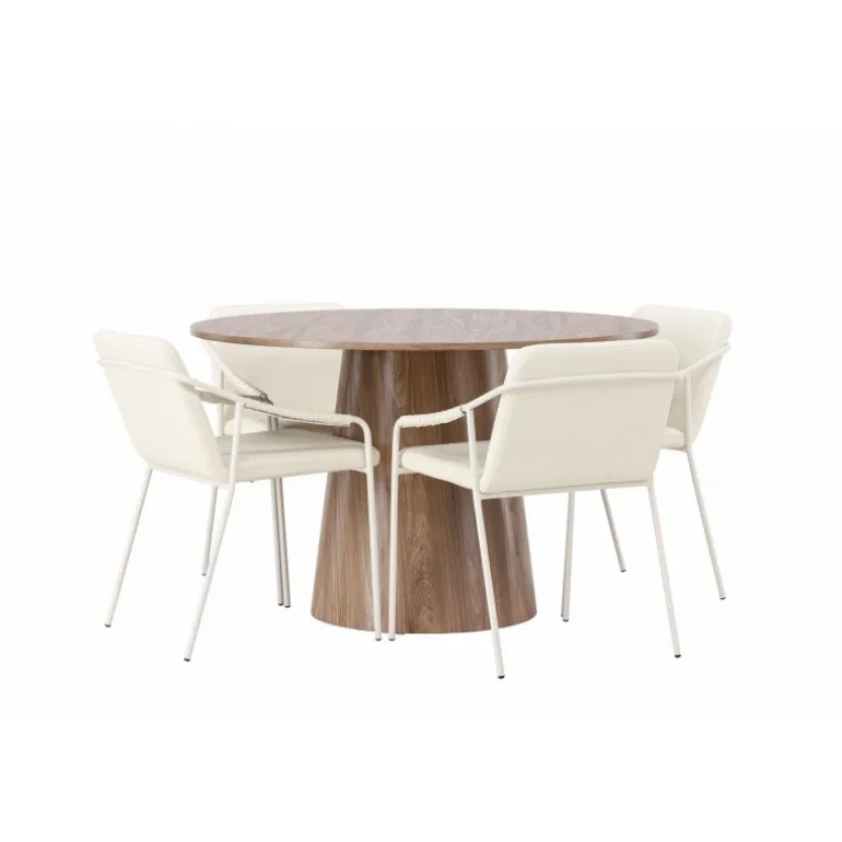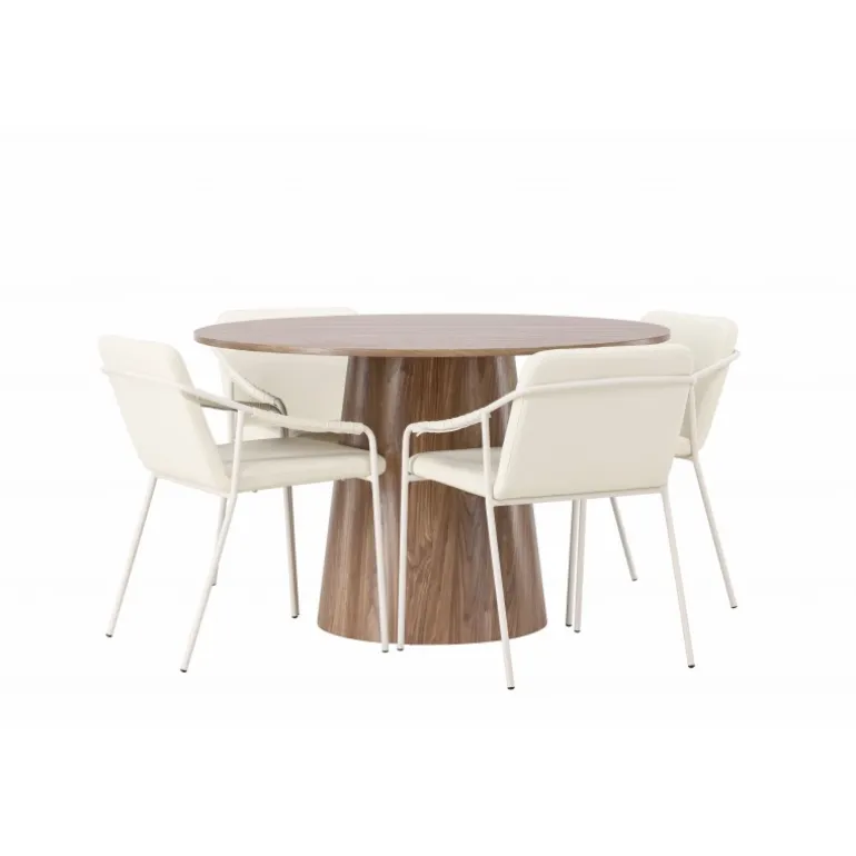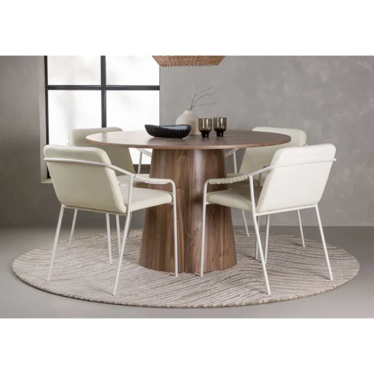 Skab et charmerende midtpunkt i dit hjem med et moderne Spisebordssæt i lyse farver! Det runde spisebord Lanzo er lavet af høj-kvalitets MDF-materiale og har en tynd, rund bordplade, der giver et moderne og elegant udtryk. Bordets mest fremtrædende træk er den snoede cylinderformede base, som pryder midten af bordet og giver det et unikt og iøjnefaldende touch. Den jordnære farve fremhæver også materialets naturlige mønstre og skaber en varm og indbydende atmosfære i din spisestue. Bordet har en diameter på 120 cm. Her har vi suppleret det træfarvede spisebord med stole fra Tvist-serien. Stolen har et behageligt sæde og ryglæn, polstret i blødt beige polyurethanlæder og polyester. De stilfulde hvide jernben giver en stabil og pålidelig base. Med dette Spisebordssæt skaber du en tidløs og elegant atmosfære, mens du tilbyder en praktisk løsning til alle kommende hyggelige måltider!