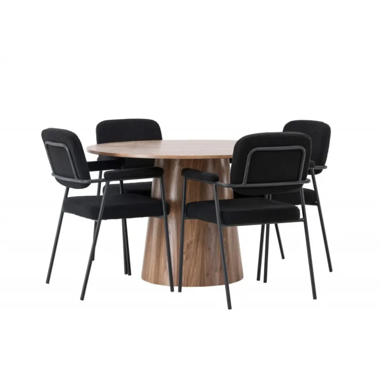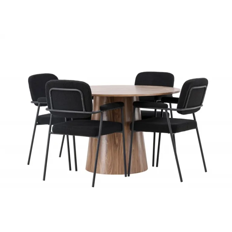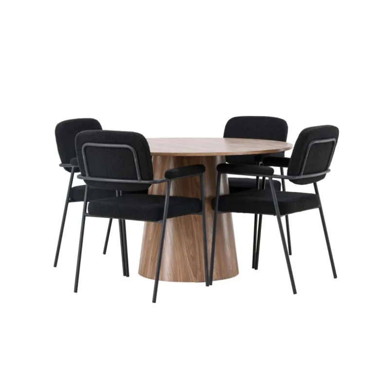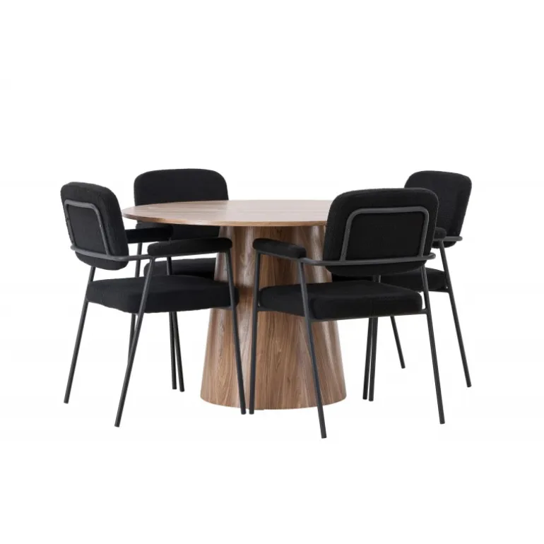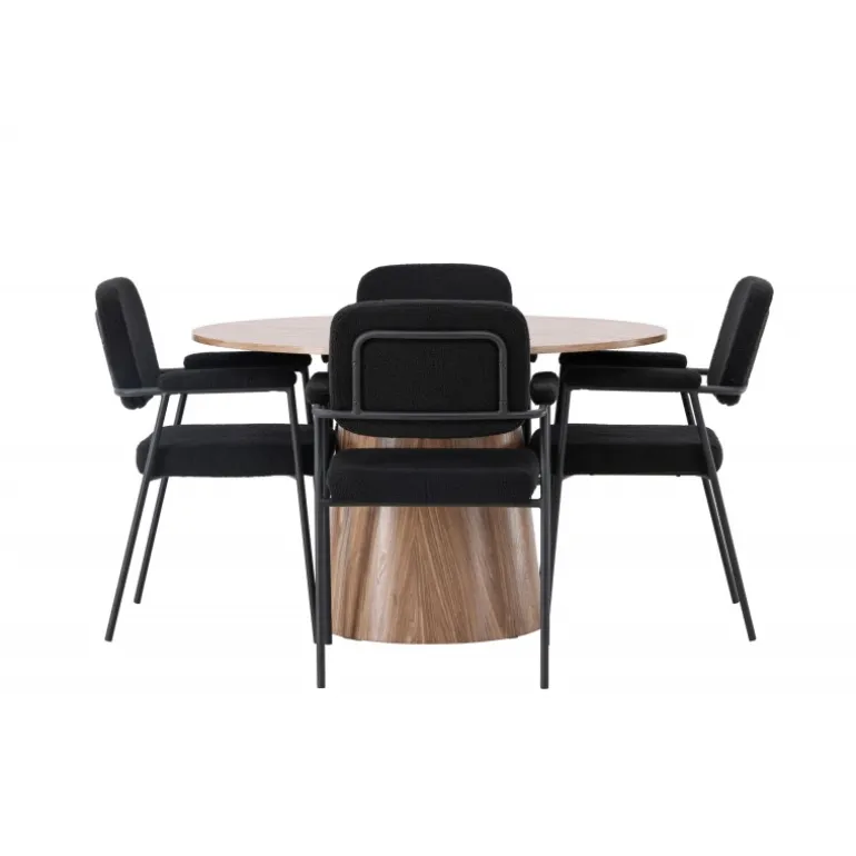 Indret dit hjem indbydende, stilfuldt og moderne med et Spisebordssæt, der udstråler modernitet og komfort! Vores træfarvede spisebord, Lanzo, imponerer med sit skandinaviske design og smagfulde håndværk. Bordet er lavet af MDF og har en rund bordplade samt en robust snoet cylindrisk base, der er centreret under midten af bordet. Den jordfarvede farve fremhæver materialets smukke mønster og skaber en harmonisk atmosfære. Bordet måler 120 cm i diameter. For at komplementere det stilfulde spisebord kombinerer vi det med sorte spiseborde fra Yesterday-serien. Disse trendy og komfortable spiseborde er tidløse. Stolen har et fuldt polstret sæde i sort bouclé stof, hvilket giver en elegant og luksuriøs følelse. De slanke sorte metalben giver ikke kun stabilitet, men de integrerede armlæn tilbyder også ekstra komfort og støtte. Med Lanzo spisebordet og stolene fra Yesterday-serien får du ikke kun et praktisk og funktionelt Spisebordssæt, men også en stilfuld og elegant interiørdetalje, der vil gøre dig stolt af dit hjem!