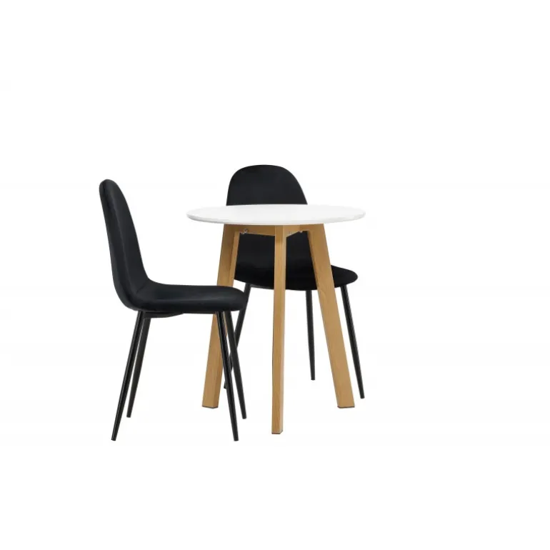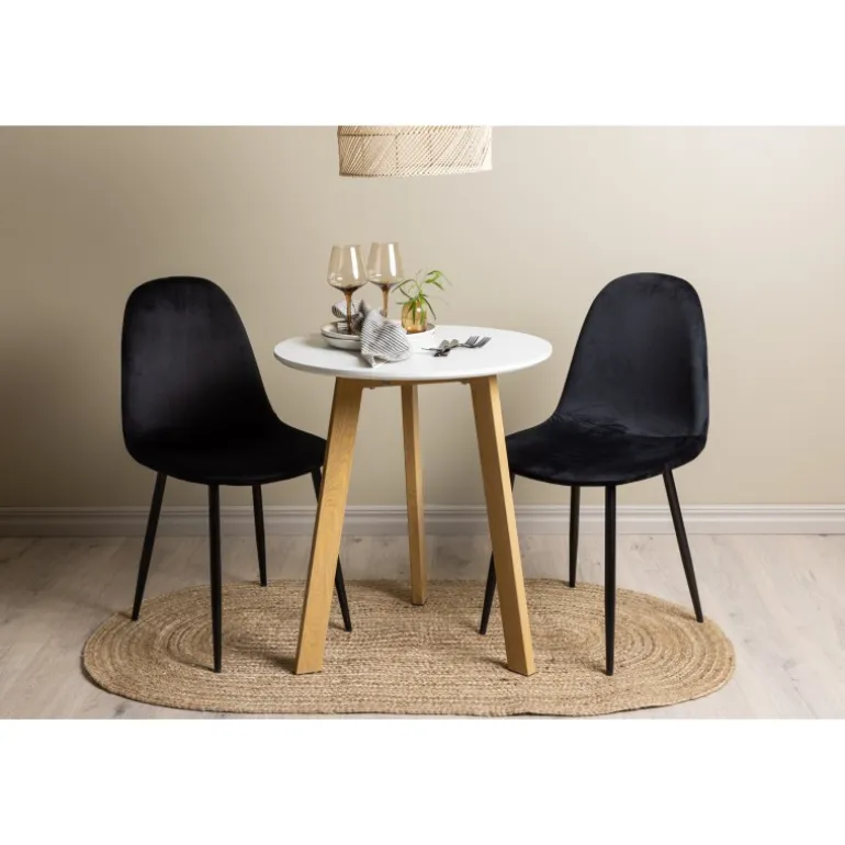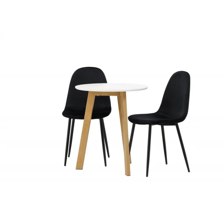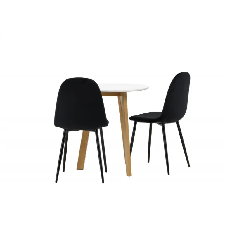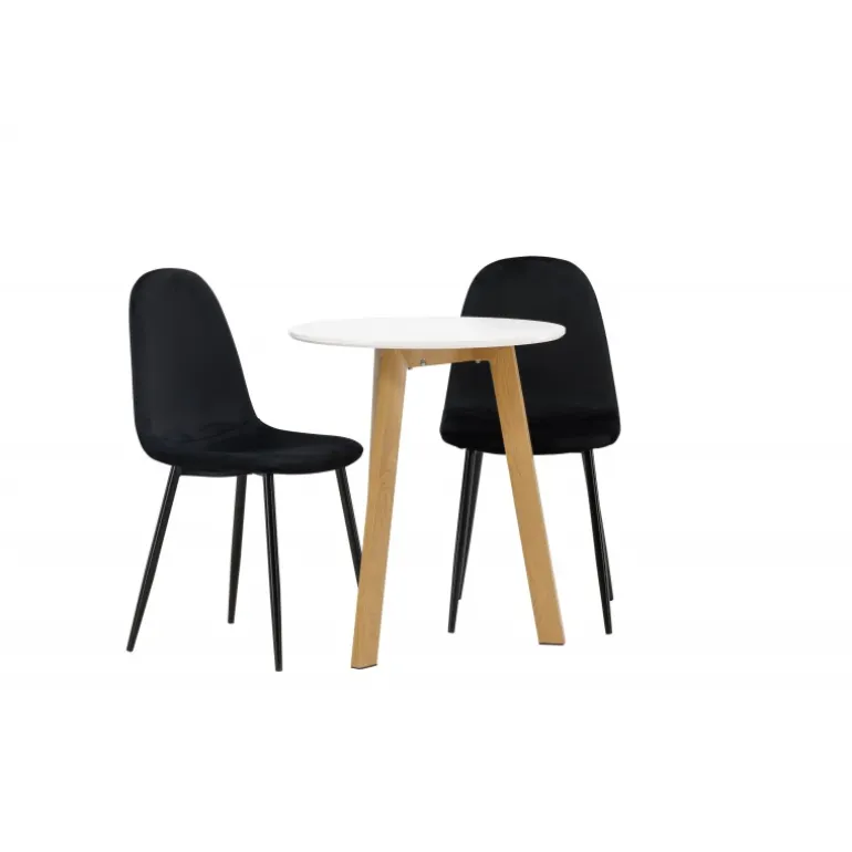 Et perfekt Spisebordssæt til det mindre køkken! Det runde spisebord Leonora har en rund bordplade i hvid MDF og en trebenet ramme i en dejlig egetræslook. Her i fantastisk kombination med sorte spisestole fra Polar-serien. Stolen har et fuldt polstret design, ben i sort pulverlakeret metal og en rundet ryg og sæde i sort fløjl med blød polstring. Sid komfortabelt og nyd lækre måltider! Bordets diameter: 65 cm.