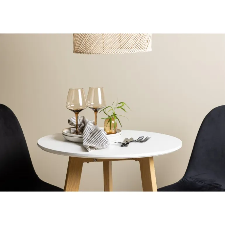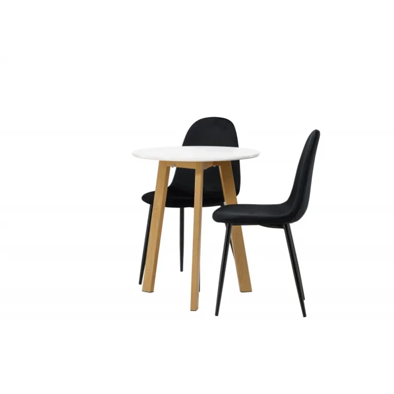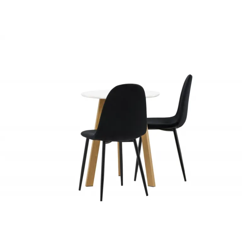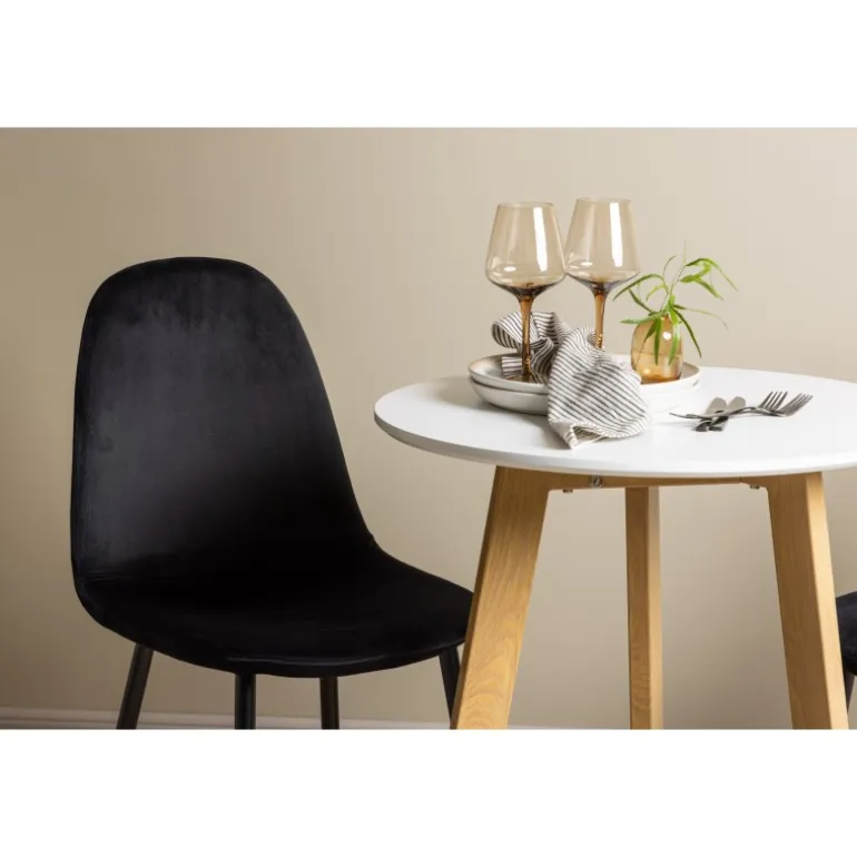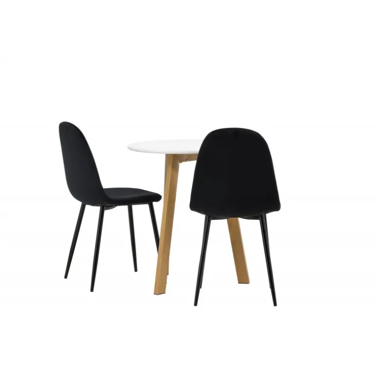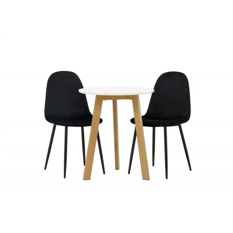Et perfekt Spisebordssæt til det mindre køkken! Det runde spisebord Leonora har en rund bordplade i hvid MDF og en trebenet ramme i en dejlig egetræslook. Her i fantastisk kombination med sorte spisestole fra Polar-serien. Stolen har et fuldt polstret design, ben i sort pulverlakeret metal og en rundet ryg og sæde i sort fløjl med blød polstring. Sid komfortabelt og nyd lækre måltider! Bordets diameter: 65 cm.