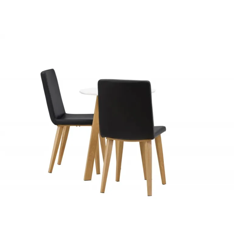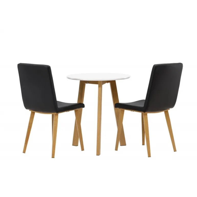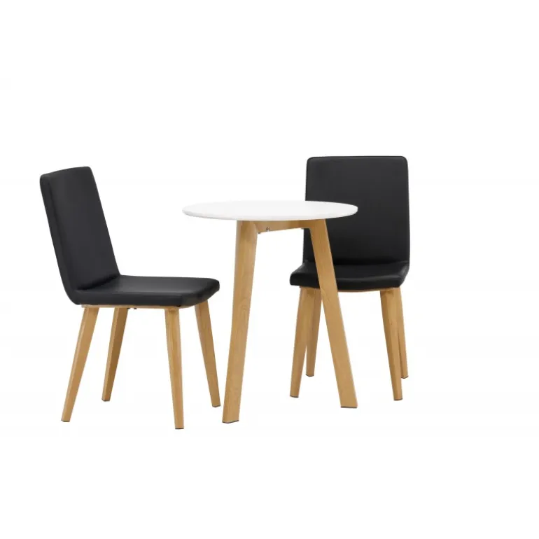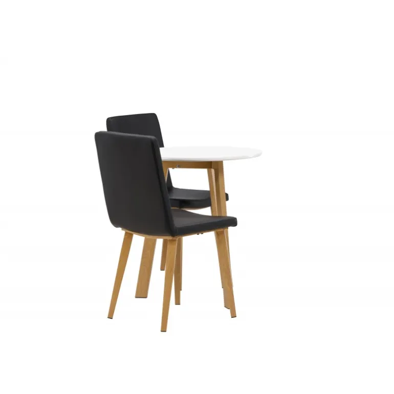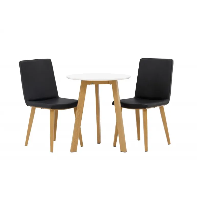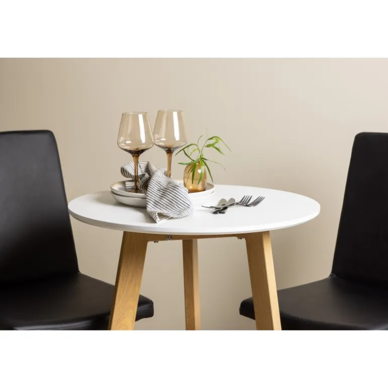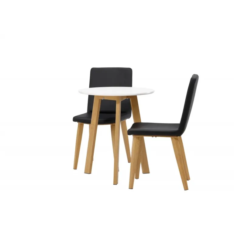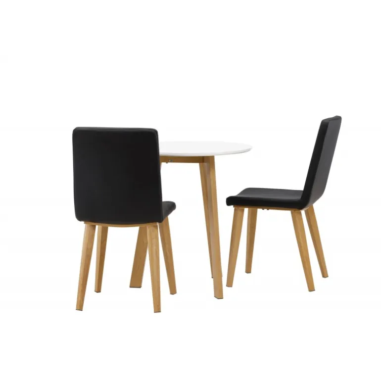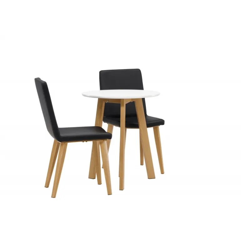 Et klassisk Spisebordssæt til to! Det runde spisebord Leonora har en rund top i hvid MDF og et trebenet stel i en smuk egetræslook. Sammen med klassiske spisestole fra Today-serien. Stolen har lige nordiske former og en fuldt polstret sæde i sort kunstlæder. Stolebenene er let skråtstillede i naturligt træ og giver et stabilt indtryk. Perfekt til det lille køkken! Borddiameter: 65 cm.