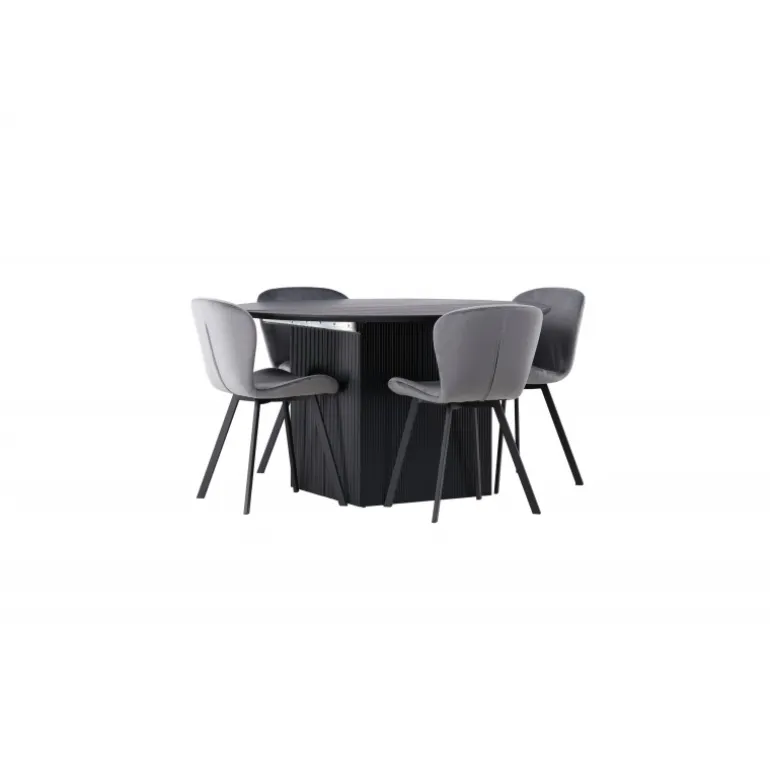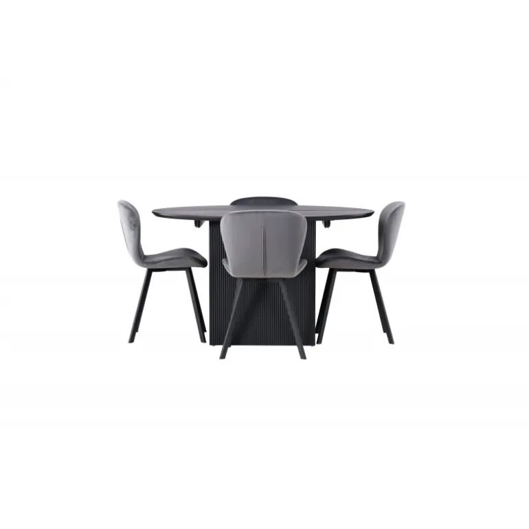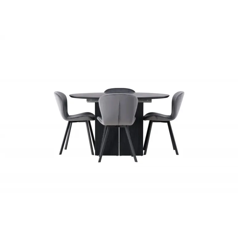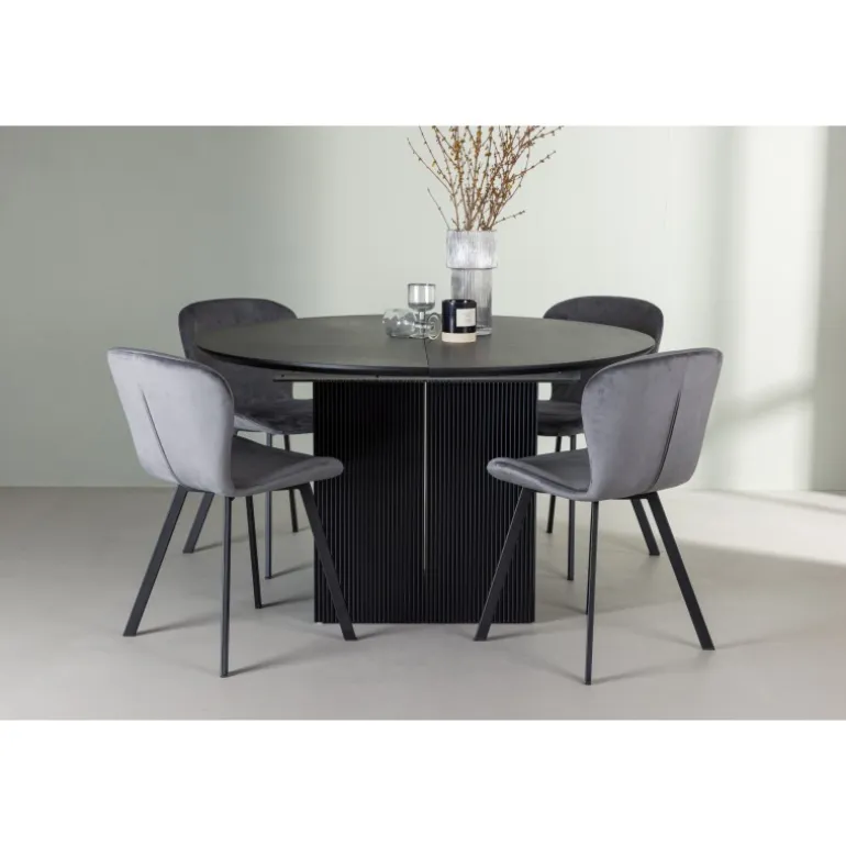 Skab en smart og elegant atmosfære i dit hjem med et udtrækkeligt Spisebordssæt i sort farve! Med det runde spisebord Matilda får du ikke kun en smuk indretningsdetalje, men også en praktisk løsning til at rumme flere gæster. Bordpladen er lavet af sort MDF med finer, og den robuste base består af to blokformede ben, der giver god stabilitet til bordet. Den udtrækkelige bordplade omdanner hurtigt bordet til en oval form, så du undgår bekymringer om, hvorvidt alle kan være der. Bordet måler 130 cm i diameter. For at skabe et komplet Spisebordssæt har vi parret spisebordet med de elegante stole fra Lilja-serien. Med deres smidige, afrundede form og grå polyesterstofsæder tilbyder Lilja en komfortabel og stilfuld siddeplads. De let spredte sorte metalben på stolene tilføjer et moderne og elegant touch til det samlede indtryk. Giv hjertet af dit hjem et personligt præg og nyd fleksibilitet, stil og komfort med Matilda spisebordet og Lilja stolene!