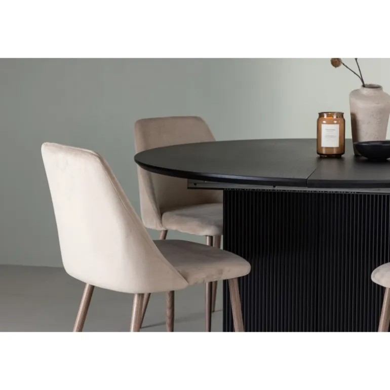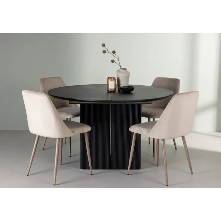 Smart, slankt og stilfuldt – et praktisk Spisebordssæt, der hurtigt tilpasser sig dine behov og antallet af gæster. Ingen grund til bekymring om at kunne rumme alle! Vores runde spisebord Matilda er designet til perfekt at opfylde dine behov. Med sin runde top i sort MDF med finer og dens robuste ramme med blokformede ben, tilføjer Matilda et stilfuldt touch til dit hjem. Bordet er udtrækkeligt og forvandles hurtigt til et ovalt bord, når du har familie og gæster på besøg. Bordets diameter måler 130cm. Sammen med vores brune spisestuestole fra den populære Night-serie skaber du en hyggelig atmosfære med et strejf af naturlig skønhed. Night-stolen har en jordnær nuance, der bestemt vil imponere dine gæster. Med et fuldt polstret sæde i brunt velourstof og elegante stoleben i valnødfarvet stål, tilbyder Night-serien en perfekt balance mellem komfort og stil. Her tilbydes du den ultimative kombination af tilpasningsevne og elegance. Lad din spisestue reflektere din personlige stil og skab mindeværdige øjeblikke med familie og venner – ingen vil blive ladt ude på kanten!