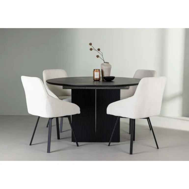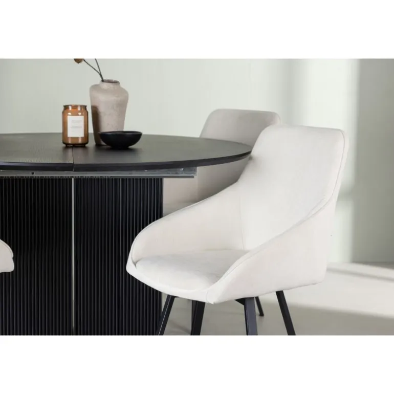 Et stilfuldt Spisebordssæt, der føles lige så klogt som det er gennemtænkt med sit modebevidste design, smarte funktioner og justerbare størrelse! Vores runde spisebord Matilda kan hurtigt omdannes til et ovalt bord med sin udvidelige funktion. Med en rund bordplade i sort MDF finer og robuste, blokformede ben tilføjer Matilda også et moderne og elegant touch til dit hjem. Bordet måler 130 cm i diameter. Her har vi kombineret det sorte spisebord Matilda med vores vidunderlige beige spisebordsstole Rosie. Disse stole i skandinavisk design har en fuldt polstret sæde med integrerede armlæn i beige stof og let skråtstillede stoleben i sort metal. Det bløde sæde er polstret for ekstra komfort, hvilket gør det muligt for dig at nyde lange og behagelige middage med lethed. Giv dit hjem en stilfuld opdatering og skab en atmosfære af elegance og funktionalitet, samtidig med at du giver dig selv og dine gæster en følelse af stil og komfort!