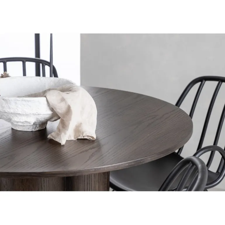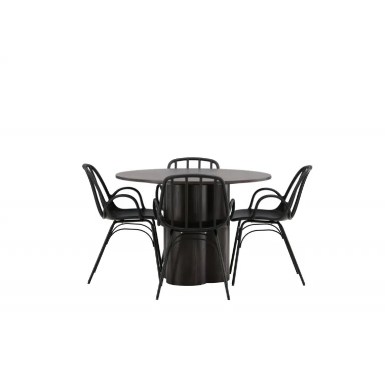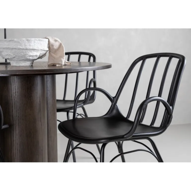 Skab en trendy atmosfære i hjertet af dit hjem! Spisebordet Olivia imponerer med sit skandinaviske design og smagfulde udseende. Bordet har en helhedsorienteret slank mocca farve. Den runde bordplade er lavet af MDF og stellet består af tre cylinderformede ben, der er samlet under midten af bordet. Her sammen med spisebordsstole fra serien Dyron. Denne dejlige spisebordsstol er lige så stilfuld som den er praktisk, fremstillet af sort plastik og stål. Stolen har integrerede armlæn og et ribbet design i den let rundede ryg. Lad tiden her være dagens højdepunkt!