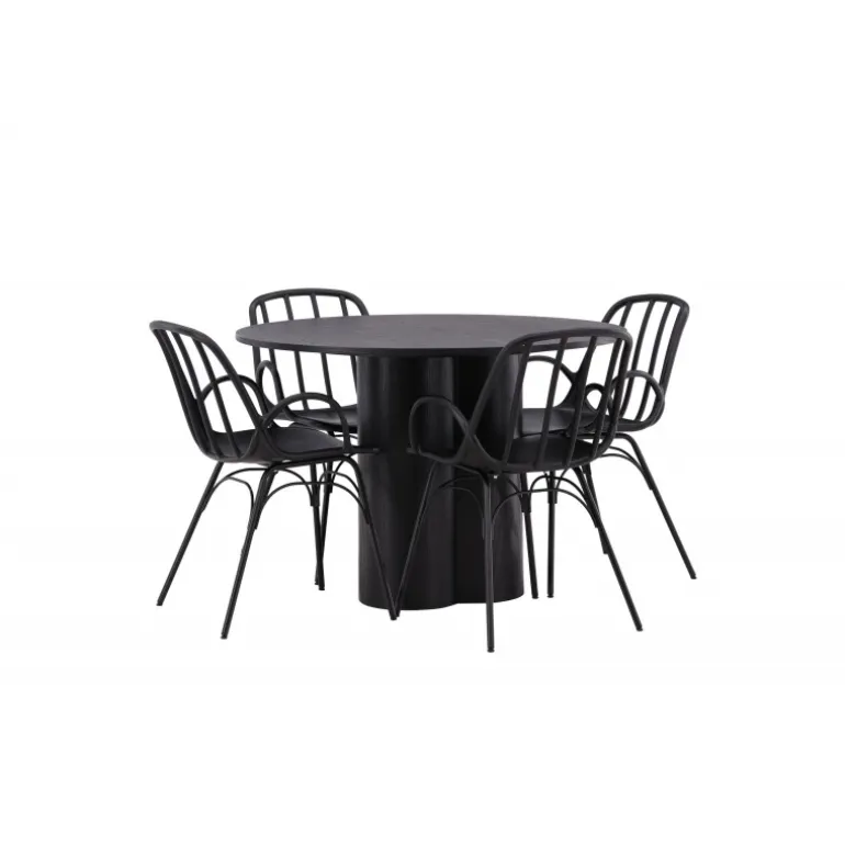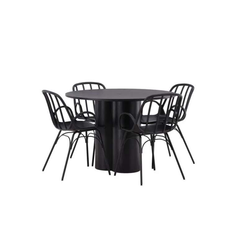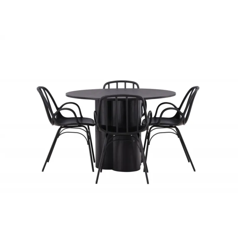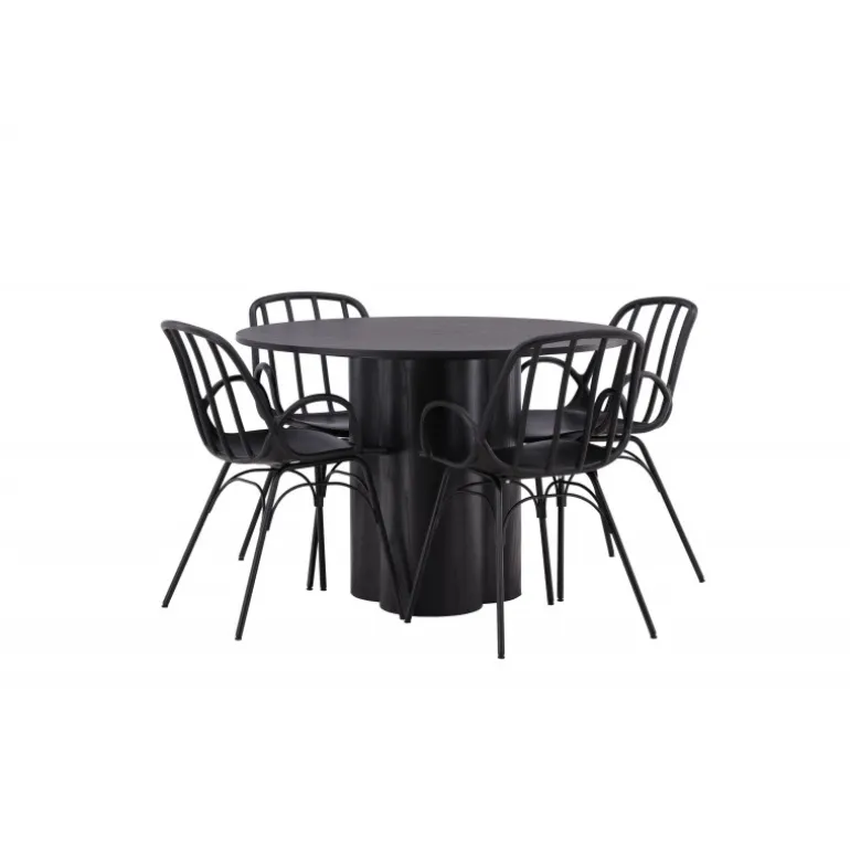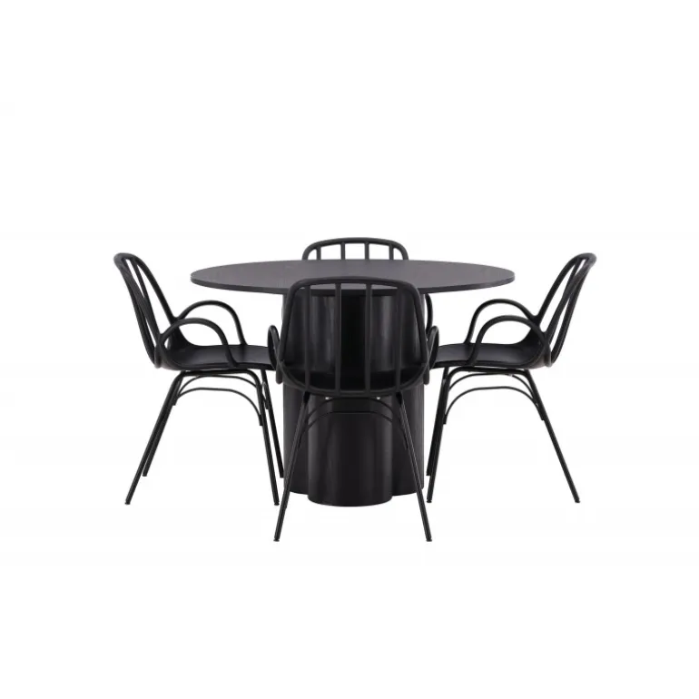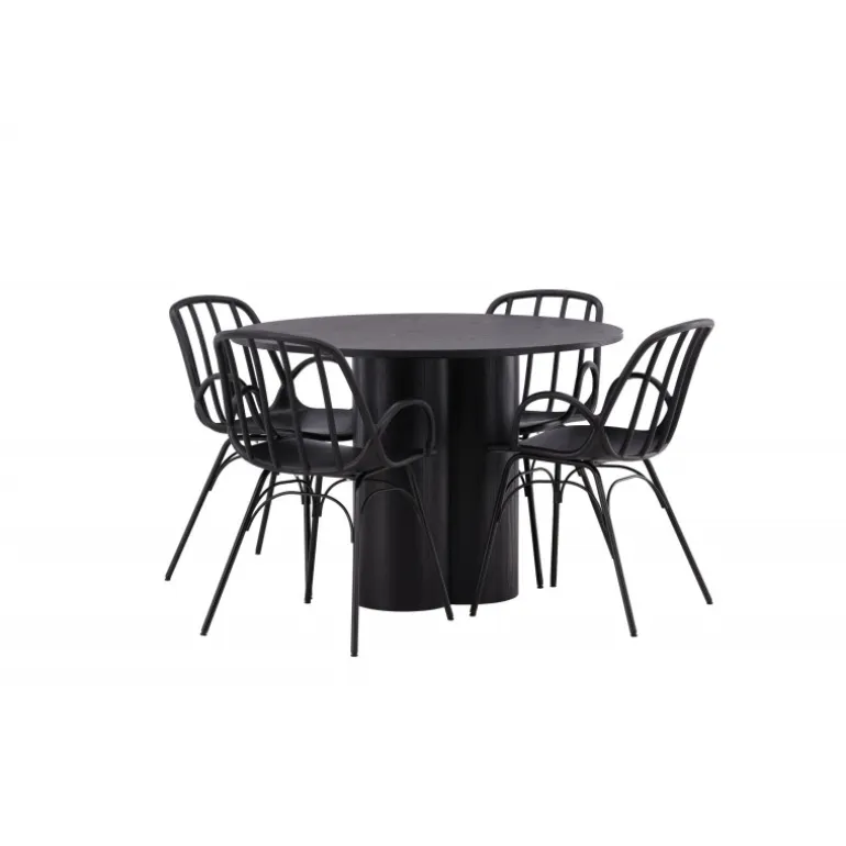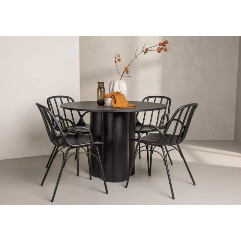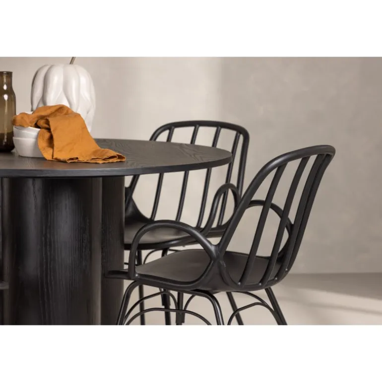 Skab en indbydende atmosfære i hjertet af dit hjem! Spisebordet Olivia imponerer med sit skandinaviske og smagfulde design. Bordet har en gennemgående design i sodet, sort farve. Den runde bordplade er lavet af MDF, og stellet består af tre cylinderformede ben, der er samlet under midten af bordet. Her sammen med spisestole fra serien Dyron. Denne skønne spisebordsstol er både stilfuld og praktisk, lavet af sort plastik og stål. Stolen har integrerede armlæn og et ribbet design i den let rundede ryg. Lad tiden her være dagens højdepunkt!