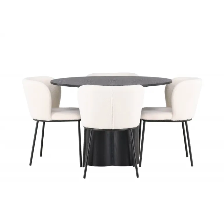 Velkommen til et Spisebordssæt, der kombinerer stil, komfort og elegance! Dette Spisebordssæt skaber hurtigt en perfekt harmoni mellem design og funktionalitet, der vil forvandle din stue til et charmerende midtpunkt. Vores runde spisebord, Olivia, imponerer med sit unikke design. Bordet har en slank bordplade og er lavet af sort fineret MDF med en let tekstureret overflade, der fremhæver materialets smukke mønster. De tre cylinderformede ben, samlet i midten af bordet, giver en stabil base og tilføjer et moderne touch til designet. Bordets dimensioner: 110 cm. Her, i perfekt kombination, er spisestolene fra Edina-serien. Disse stole kombinerer et fleksibelt og fuldt polstret sæde i hvid bouclé stof med minimalistiske sorte metalben. Det slanke design tilbyder en tidløs følelse, og det komfortable sæde sikrer, at du og dine gæster kan nyde lange og behagelige middage. Skab en atmosfære af stil og hygge i dit hjem med dette smukke Spisebordssæt, der garanterer, at du og dine gæster vil sidde så komfortabelt som luksuriøst!