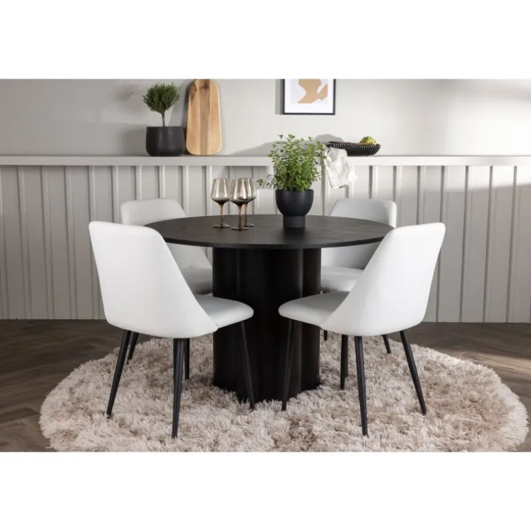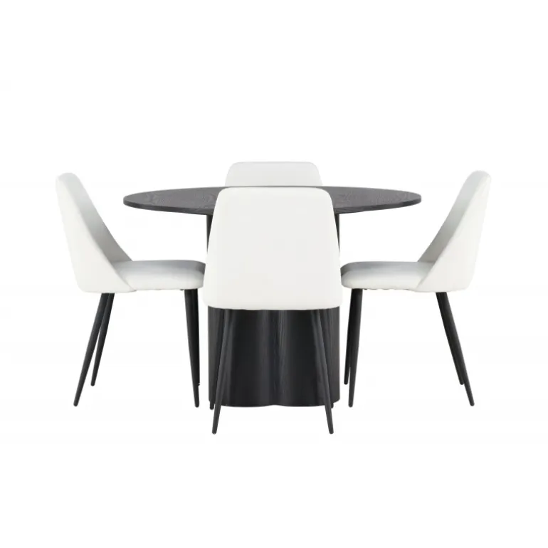 Kombiner farver og materialer som i dette Spisebordssæt, og bemærk, hvordan niveauet af stil i dit hjem løftes! Vores runde spisebord Olivia er et mesterværk af design og funktionalitet. Bordet kommer i en røgfarvet sort farve og har en slank, rund bordplade. De tre cylinderformede ben, elegant placeret under midten af bordet, giver et solidt og balanceret fundament. Fremstillet udelukkende af bæredygtigt MDF. Bordets dimensioner: 110 cm. Her i en vidunderlig kombination med vores hvide stole fra Night-serien. Den hvide PU-polstring giver en følelse af eksklusivitet og desuden fantastisk komfort. Stolens sorte stålben er ikke kun robuste, men bidrager også til dens moderne og distinkte udseende. Takket være det polstrede sæde kan du sidde ved spisebordet i lang tid uden at gå på kompromis med komforten. Med dette Spisebordssæt kan du skabe en atmosfære, der udstråler tidløs elegance og eksklusivitet. Hvert eneste detalje er nøje udvalgt for at give dig den bedste kombination af stil og komfort, så lad dit hjem stråle af dette og indret det indbydende i fremtiden!