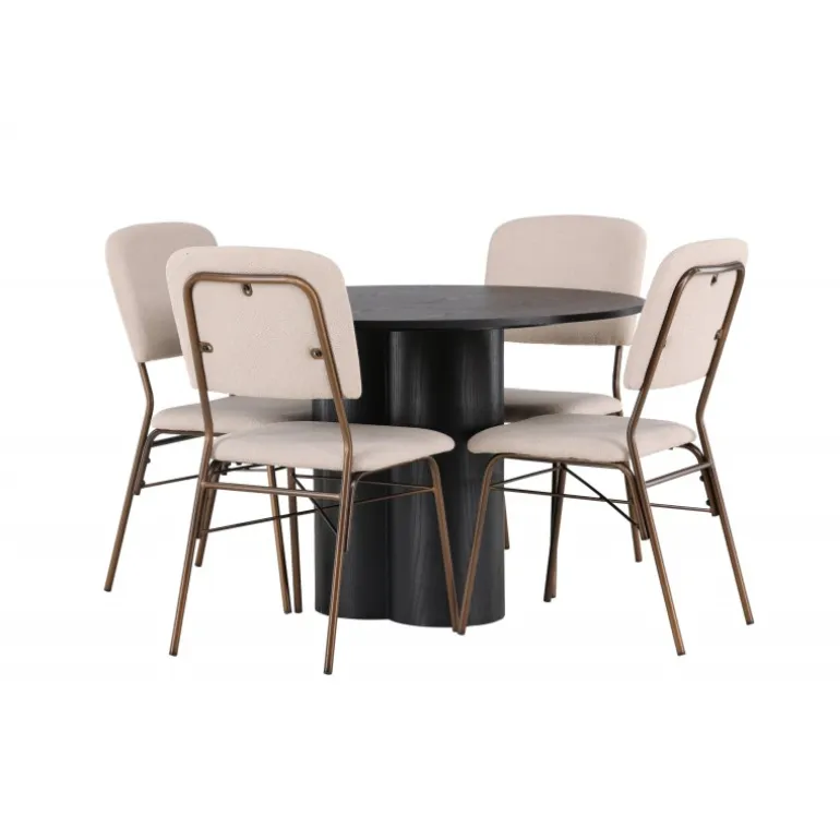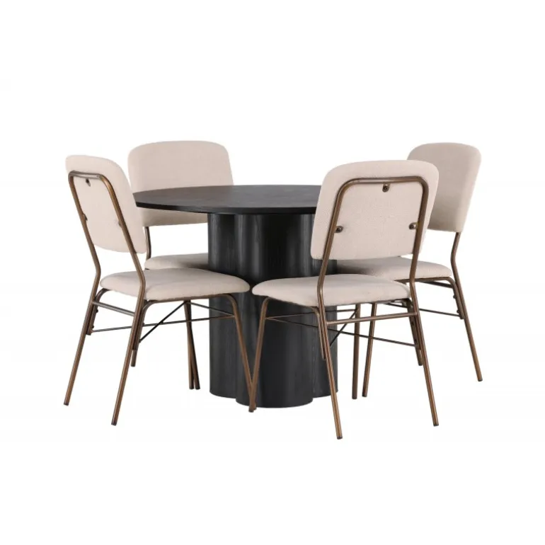 Giv dit hjem en følelse af stil og charme med dette tidløse Spisebordssæt! Med sit elegante design og højkvalitetsmaterialer vil dette Spisebordssæt hæve niveauet af stil i din stue og skabe en indbydende atmosfære til fremtidige middagsfester. Vores runde spisebord Olivia er det perfekte valg for dem, der ønsker et moderne touch i deres hjem. Med sin runde form og tynde bordplade giver dette bord et elegant udtryk. De tre cylindriske ben, samlet under midten af bordet, giver en stabil og balanceret ramme. Bordet er lavet af sort MDF med finer, som giver en let overflade og fremhæver materialets smukke mønstre. Bordets dimensioner: 110 cm. Her er spisebordet kombineret med vidunderlige, beige spisebordsstole fra Seda-serien. Stolenes jordfarver i beige og brun passer perfekt til bordets design og skaber en stilfuld følelse. Stolenes polyesterstof med struktur giver luksuriøs komfort, og stolens ben i mørkebrunt stål giver en solid og elegant base. Hvert detalje i dette Spisebordssæt er nøje udvalgt for at give dig den bedste oplevelse. Så inviter dine kære til lækre måltider i fremtiden og undgå at gå på kompromis mellem stil og komfort!