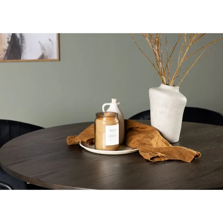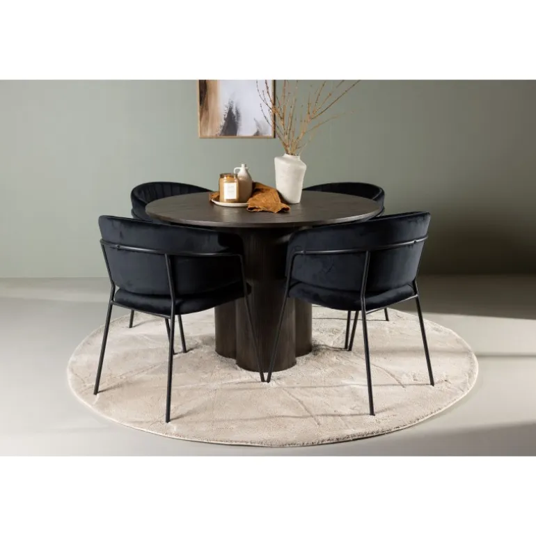 En elegant midtpunkt i stuen og høj komfort til alle sociale måltider – hvad mere kunne man ønske sig? Det slanke spisebord Olivia fremhæver moderne, jordnære toner i en luksuriøs mokkafarve og et gennemtænkt design, der skiller sig ud. Den tynde og runde MDF-bordplade giver et diskret strejf af elegance, mens de tre cylinderformede ben, der er centralt placeret under bordet, skaber en afbalanceret og stilfuld æstetik. Bordets diameter: 110 cm. Her er spisebordet parret med slanke spisestole fra Selma-serien for at fuldende din oplevelse af komfort og stil. Disse stole har et omsluttende design med en let rundet ryg og et blødt velourpolstret sæde. De dekorative syninger tilføjer et strejf af luksus, og de sorte stålstoleben er ikke kun elegante, men giver også stabilitet og støtte. Oplev et nyt niveau af elegance og komfort med dette indbydende Spisebordssæt. Skab en atmosfære, der garanteret vil inspirere til fællesskab, uden nogen risiko for at ende på kanten. Lad din spiseoplevelse blive enestående med denne moderne kombination af design og komfort!