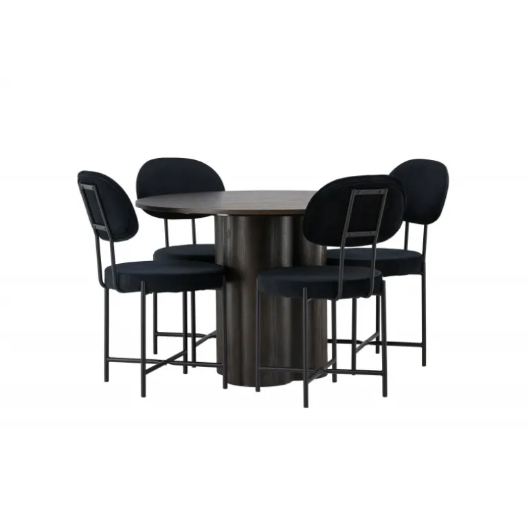 Skab stil og komfort med et indbydende Spisebordssæt, der sikrer, at ingen ender på kanten! Vores runde spisebord Olivia har et unikt og smagfuldt design i moderne, jordnære toner. Den skandinaviske stil er gennemgående og bidrager til en tidløs følelse. Bordet kommer i en stilfuld mocca farve i MDF, hvilket giver det et sofistikeret præg. Den tynde, runde bordplade skaber en flot kontrast til bordets robuste stel, der består af tre cylindriske ben samlet i midten. Bordets dimensioner: 110 cm. Sammen med vores elegante spisebord Olivia tilbyder vi vores stilfulde spisestole fra Stella-serien. Disse stole giver ikke kun stil, men også vidunderlig komfort. Stolen har et rundt sæde, og ryglænet er polstret i sort fløjlstof. Dette giver ikke kun en luksuriøs følelse, men også et blødt og behageligt sted at sidde under lange middage. Og sidst men ikke mindst, de sorte stålben på stolen komplementerer helheden perfekt med deres minimalistiske præg. Forhøj din stue med Olivia og Stella Spisebordssættet. Skab en atmosfære af stil, komfort og elegance, der vil imponere både dig og dine gæster, og lad tiden her blive dagens højdepunkt!