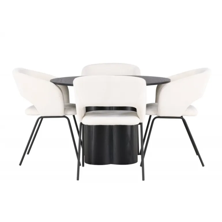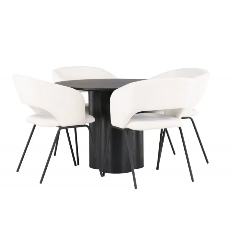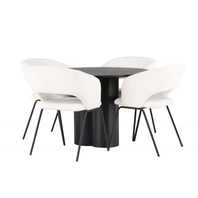 Velkommen hjem til en fascinerende fremvisning af stil og elegance med dette runde Spisebordssæt. Dette moderne spisebord og de medfølgende stole fra Day-serien vil forvandle dit hjem til en moderne oase! Vores runde spisebord Olivia præsenterer et skandinavisk design, der straks fanger øjet. Den røgede sorte farve og holdbare MDF-materiale giver dig et tidløst bord. Med sin slanke, runde bordplade og tre stilfulde cylinderformede ben samlet i midten, tilbyder Olivia dig et harmonisk samlet design, der vil imponere både gæster og familiemedlemmer. Bordets diameter: 110 cm. Her, perfekt matchet, er vores vidunderlige hvide stole fra Day-serien. Med gennemtænkt design og bløde kurver tiltrækker disse stole straks opmærksomhed. Det hvide linnedstof på sædet giver en luksuriøs følelse, mens de slanke sorte stålben tilføjer et moderne og minimalistisk touch. Sæt tonen i dit hjem med dette moderne Spisebordssæt og skab en atmosfære, der får dig til at føle dig lige hjemme. Det skal føles hyggeligt at komme hjem!