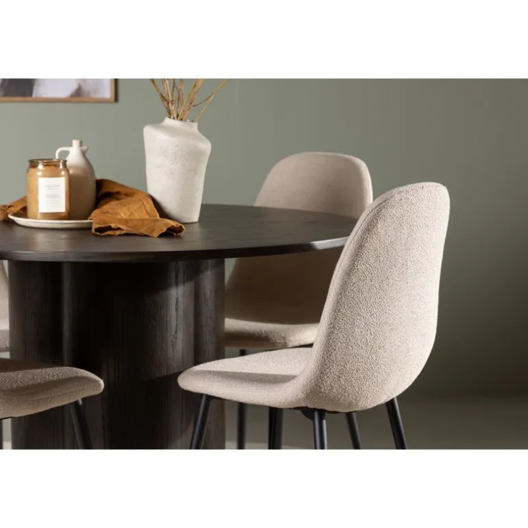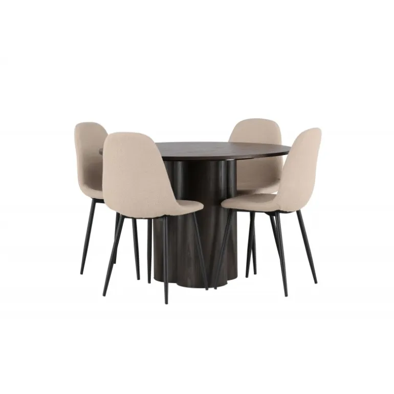 Et varmt og charmerende Spisebordssæt i skandinavisk stil, der er designet i overensstemmelse med de nyeste trends! Vores runde spisebord Olivia har en jordnær mørkebrun farve, der tilføjer en hyggelig touch til stuen. Det er lavet af høj-kvalitets MDF-materiale og har en tynd, afrundet bordplade og tre cylinderformede ben, samlet i midten af bordet. Bordets dimensioner: 110 cm. Sammen med vores beige spisestole fra Polar-serien, er Spisebordssættet komplet. Disse stole har et fuldt polstret design med en rummelig, afrundet ryglæn og sæde. Deres beige bouclé-stof med blød polstring indbyder til timers afslapning og hyggelige øjeblikke ved spisebordet. Benene er lavet af sort pulverlakeret metal, hvilket giver en elegant kontrast til bordets mørke nuance. Her behøver du ikke gå på kompromis mellem stil og komfort. Dette Spisebordssæt står tidens prøve, samtidig med at det matcher moderne former. Sæt dig ned, sid behageligt, og nyd latter og samtaler omkring et hyggeligt Spisebordssæt!
