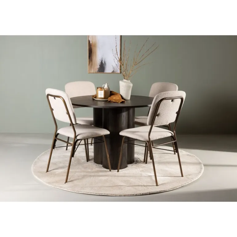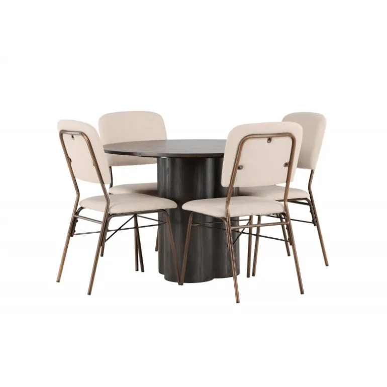 Skandinavisk elegance og fantastisk komfort – dette Spisebordssæt imponerer med sine jordnære toner og rene look! Vores mørkebrune spisebord Olivia er lavet af højkvalitets MDF-materiale og har en tynd, rund bordplade, der tilføjer et moderne touch. De tre cylinderformede ben, perfekt positioneret under midten af bordet, giver en stabil og robust konstruktion, der vil holde i mange år. Bordets dimensioner: 110cm. Sammen med det runde spisebord Olivia følger vores spisestole i skandinavisk stil fra Seda-serien. Stolen er polstret med blødt og tekstureret polyesterstof i en smuk beige nuance. Det mørkebrune stål, der udgør stolens ben, skaber en harmonisk kontrast til stoffets farve. Hvad mere kan man ønske sig? Med sin jordnære farvekombination er dette Spisebordssæt både elegant og let at matche med resten af dit interiør. Nyd aftener fyldt med latter, god mad og behageligt selskab!