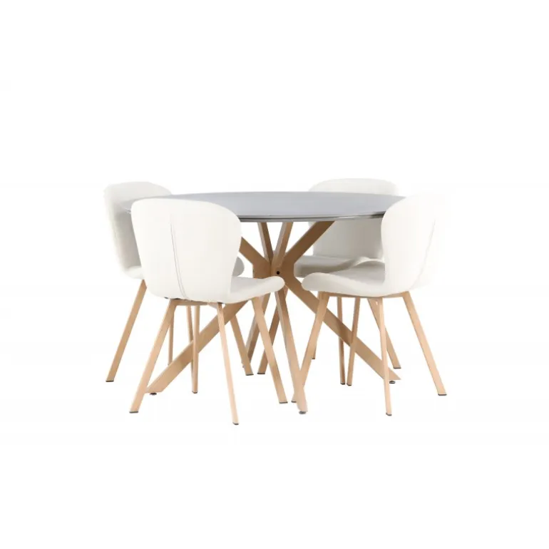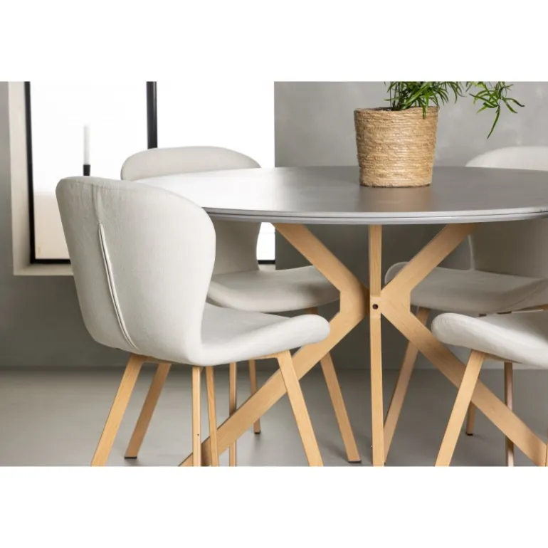 Skab en luksuriøs atmosfære i dit hjem, der føles både moderne og tidløs! Med det elskede runde spisebord fra Piazza-serien vil du opleve en følelse af ren eksklusivitet i dit hjem. Bordpladen er lavet i en smuk grå nuance i spraystone, som tilføjer en elegant touch til din indretning. Den robuste trækrydsfod giver ikke kun en stabil base, men tilføjer også en dekorativ detalje, der fanger øjet. Bordet måler 120 cm. Men det er ikke kun bordet, der imponerer – vores beige spisebordsstole fra Lilja-serien løfter din indretning til et helt nyt niveau. Disse drømmestole i lyse farver skaber en stilfuld og frisk atmosfære i din spisestue. Med fuldt polstrede sæder i beige polyesterstof skaber de en komfortabel og indbydende følelse. De flade og let udadbuede ben i egetræ matcher også spisebordet perfekt. Nyd dejlige måltider og selskab med familie og venner omkring dette elegante bord. Dette Spisebordssæt er den perfekte kombination af stil, komfort og trendy design!
