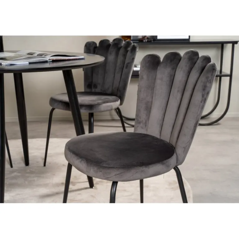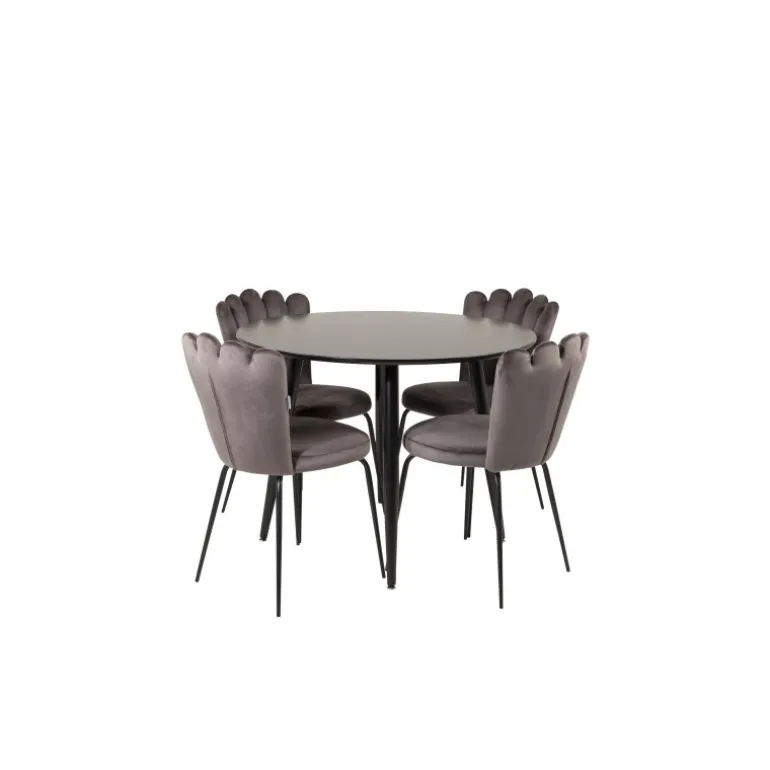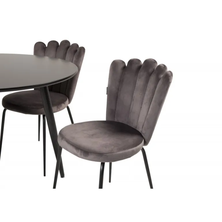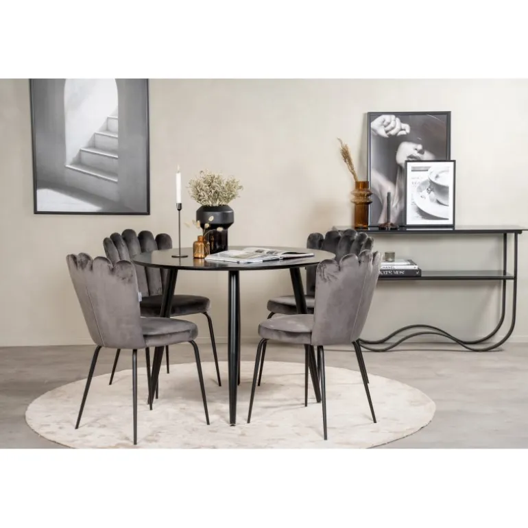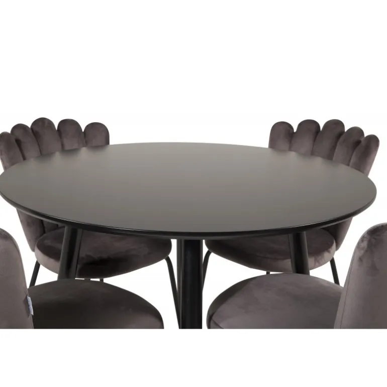 Spisebordet Plaza i et slankt design, kombineret med spisestuestolene Limhamn, er den perfekte kombination for dem, der ønsker en trendy rund Spisebordssæt. De høje siddekomfort på stolene indbyder til lange og vidunderlige stunder med socialt samvær! Spisebordet har en sort MDF-bordplade, der tilføjer et moderne touch til dit hjem. Husk, at MDF-bordplader er følsomme over for ridser og skader, så vær forsigtig med overfladen. Plejer råd: Brug en blød, tør klud til daglig vedligeholdelse, og tør straks enhver spildt væske af.