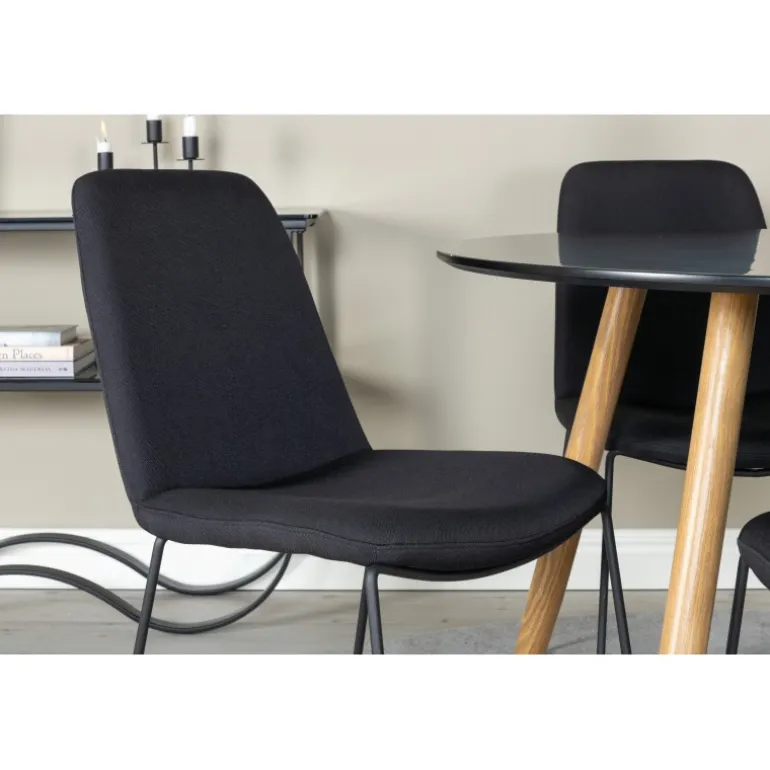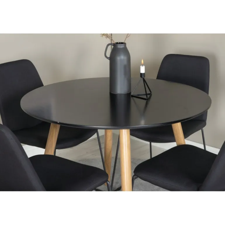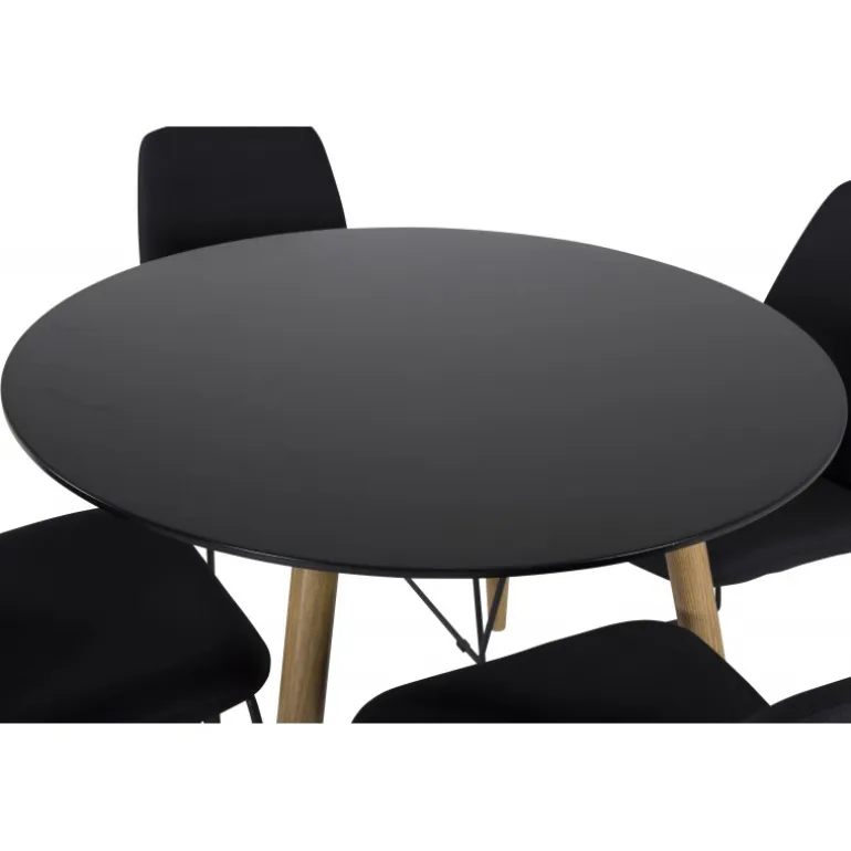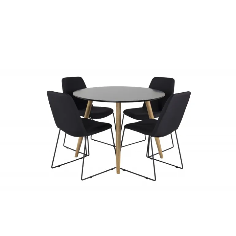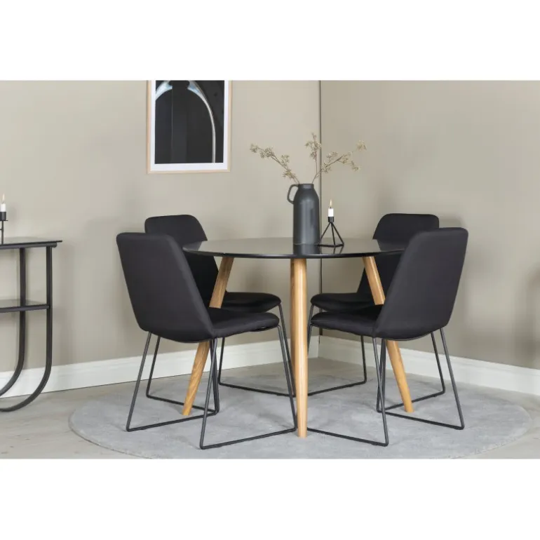 En lille og elegant Spisebordssæt, der passer perfekt til mindre rum! Plaza spisebordet er her kombineret med de moderne Muce stole. En Spisebordssæt, der passer til de fleste hjem! Sort MDF bordplade og moderne design gør sættet både stilfuldt og funktionelt. Nem at vedligeholde med de rette plejetips.