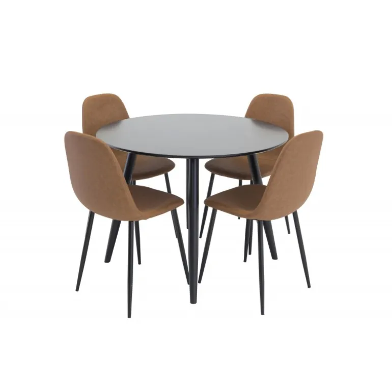 Klassisk Spisebordssæt, der passer ind i de fleste husholdninger! Spisebordet Plaza sammen med de brune stole i Polar-serien er perfekt til dem, der ønsker at skabe en hyggelig og moderne atmosfære i hjemmet. MDF-bordpladen er sort og giver et stilrent udtryk, mens de brune stole i PU tilføjer varme og komfort.