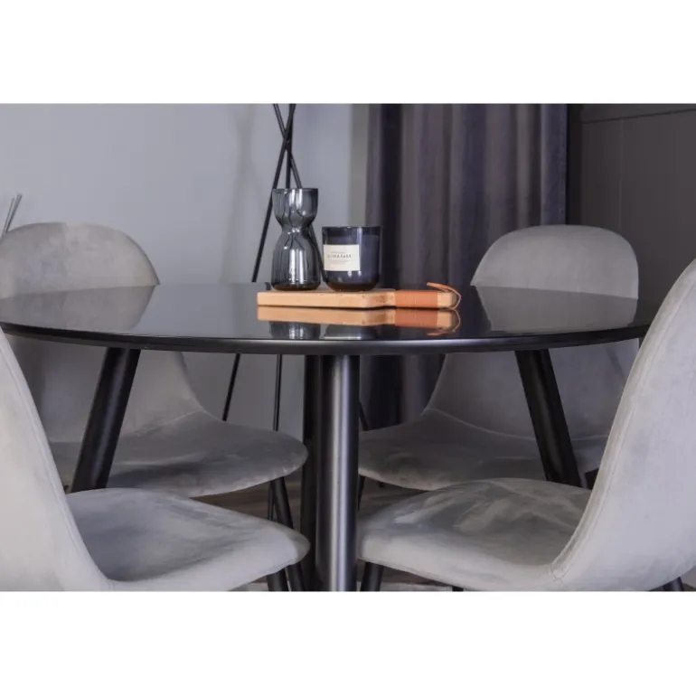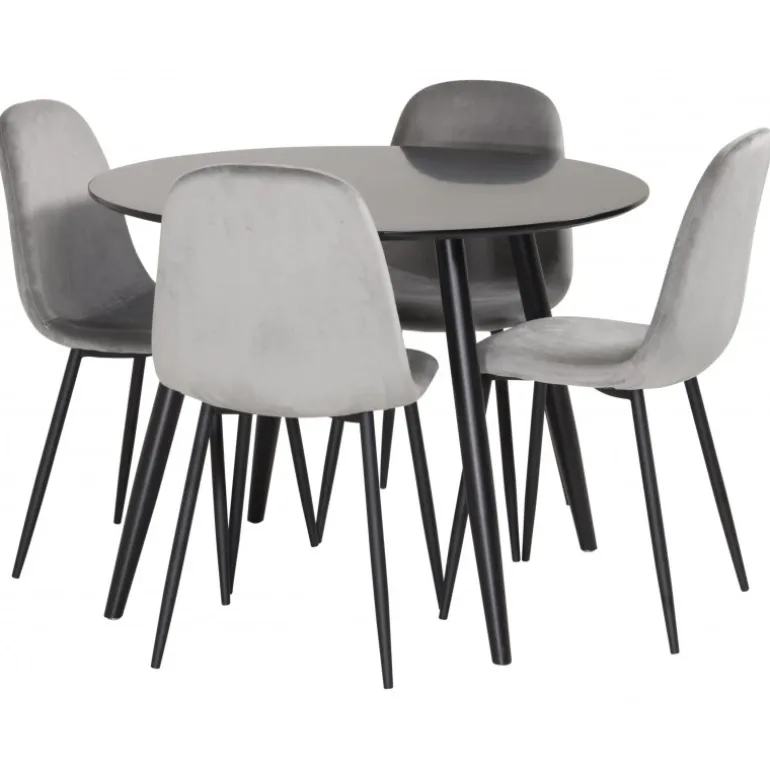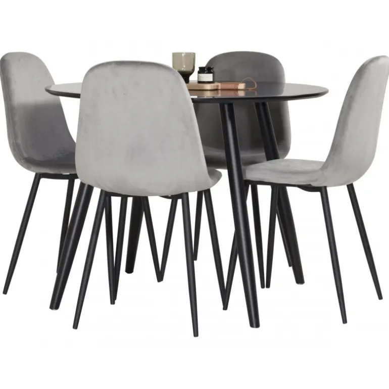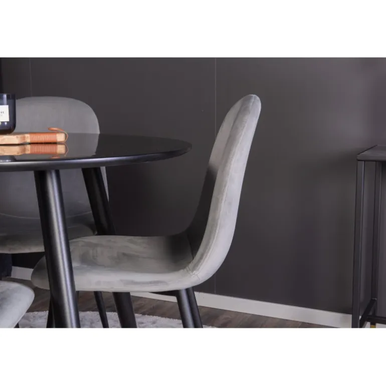 Oplev den perfekte balance mellem rustik charme og moderne elegance med Spisebordssættet Plaza og stolene fra Polar serien. Dette kompakte Spisebordssæt i neutrale farver passer ind i de fleste hjem og skaber en hyggelig atmosfære. Det sorte MDF-bord og de komfortable stole i polyester velour gør det ideelt til enhver spisestue.