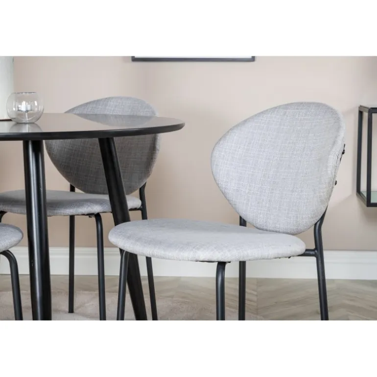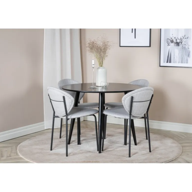 Bliv inspireret af vores stilfulde Spisebordssæt med praktisk design! Vores runde spisebord Plaza med en elegant sort bordplade sammen med grå spisebordsstole fra Vault-serien er den perfekte kombination. Spisebord og stole er valgt for deres moderne æstetik og holdbarhed. MDF-bordpladen og polyesterbetræk kræver enkel vedligeholdelse, så du kan nyde dit Spisebordssæt i mange år fremover.