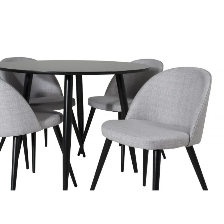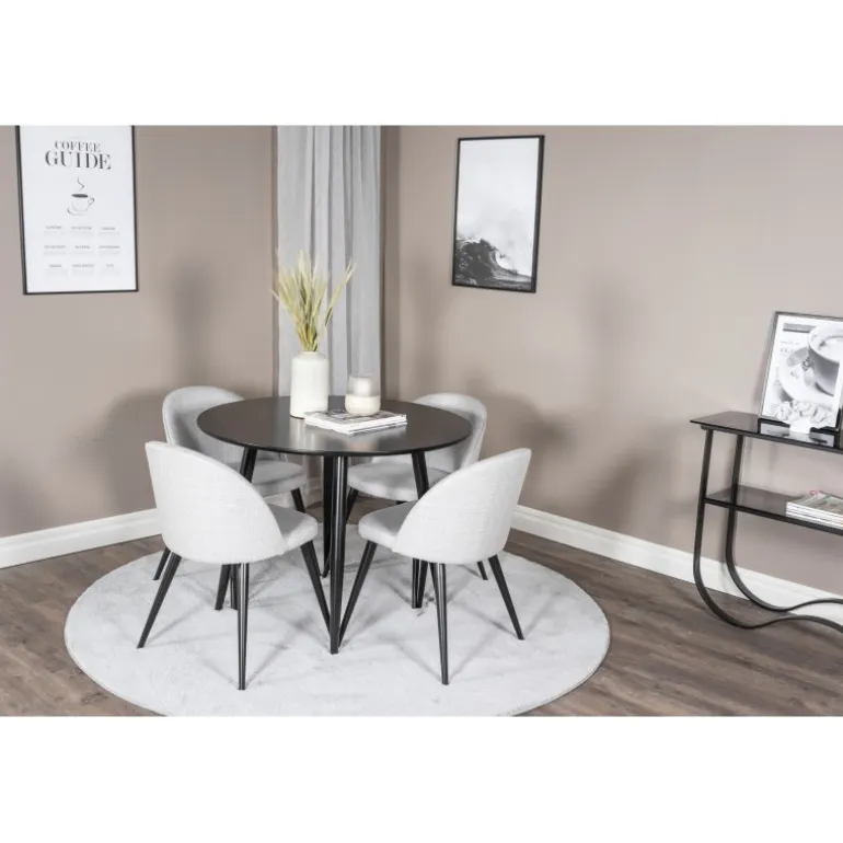 At købe et færdigkomponeret Spisebordssæt er både trend-sikkert og praktisk! Her kombinerer vi vores spisebord Plaza med vores siddevenlige spisebordsstole Velvet. Lad hjemmets hjerte præges af dit nye iøjnefaldende Spisebordssæt. Spisebordet er lavet af sort MDF, og det kræver en vis omhu for at undgå ridser og skader. Stolene er betrukket med grå polyester, som også kræver særlig pleje for at undgå falmning og pletter. Dette sæt er ideelt til dig, der ønsker både stil og funktionalitet i spisestuen.