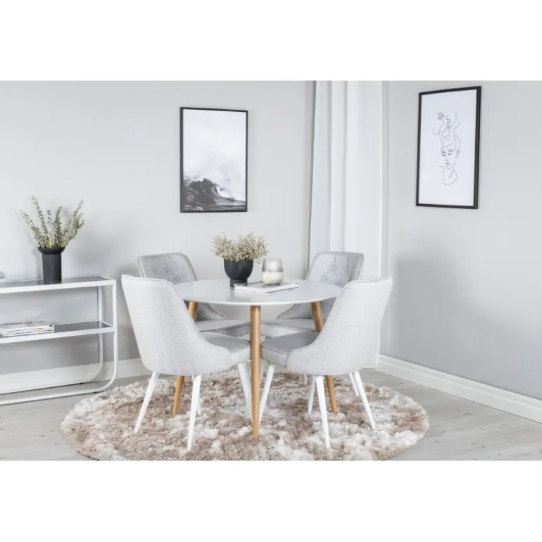 Kombiner forskellige farver og materialer for at skabe en moderne, hyggelig og tidløs spiseoplevelse med vores Spisebordssæt Plaza og stole Velvet Deluxe. Spisebord med hvid MDF-bordplade og Velvet Deluxe-stole i lys grå polyester giver dit hjem et stilfuldt og indbydende udseende. Perfekt til både hverdagsbrug og særlige lejligheder. Vær opmærksom på vedligeholdelsen af MDF-bordpladen og polyesterstoffet for at bevare møblernes skønhed.